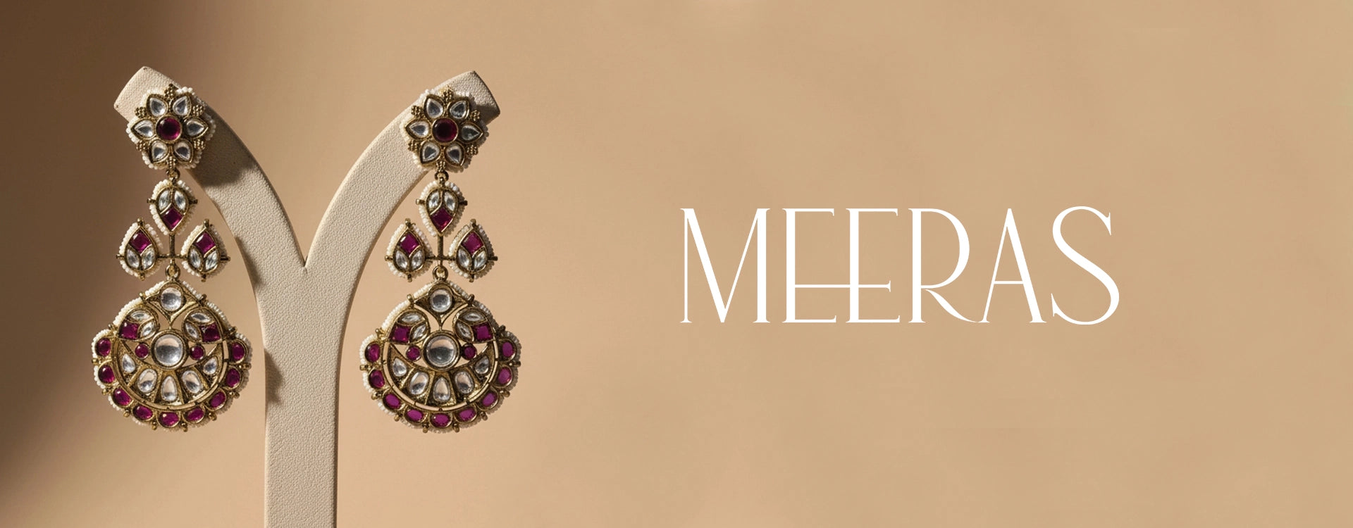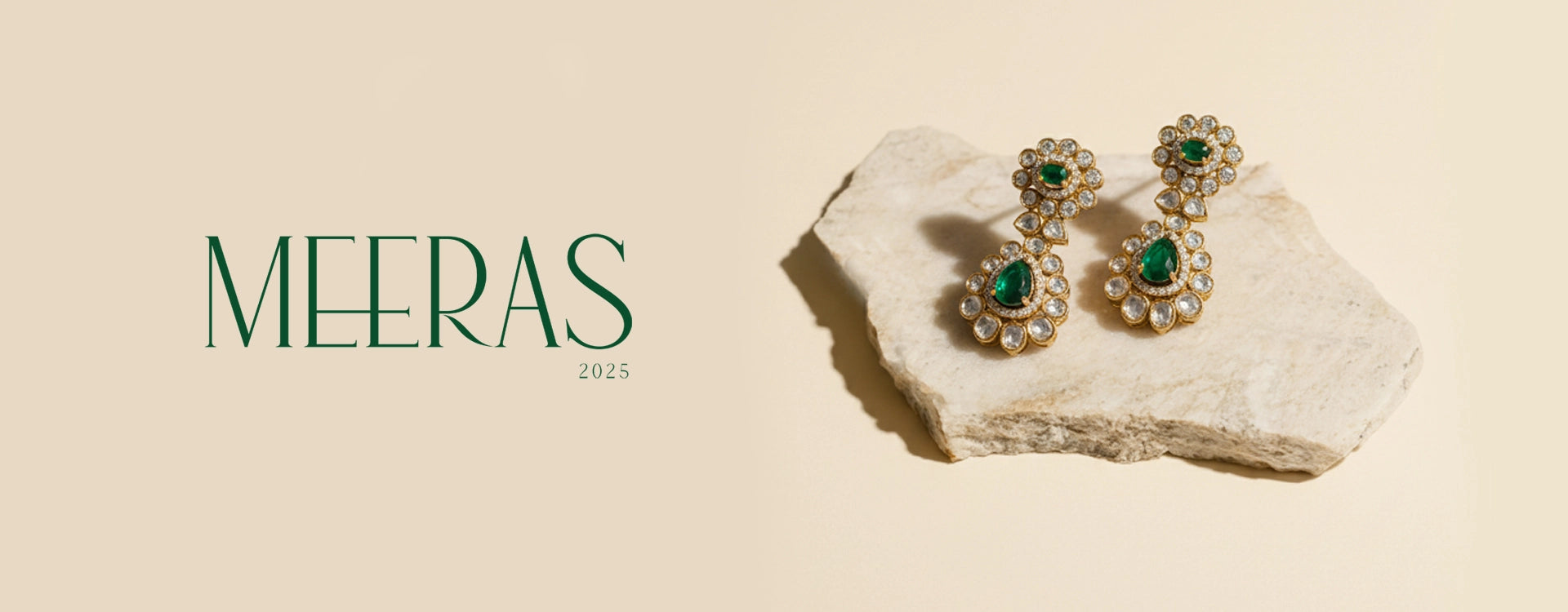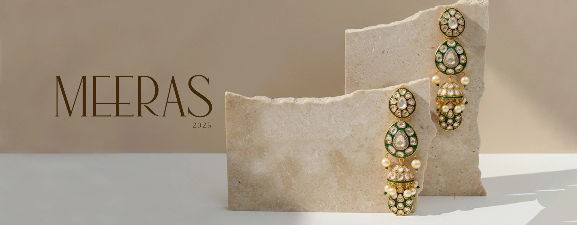 Meena Square is named for what it carries: the geometry of a sharp cut, and the subtle detailing of meena kari work, finished in gold and Polki Kundan. These are pieces that don’t stretch for attention. Instead, they hold their own with proportion and polish, offering colour without clutter. The compact square makes them easy to pair with a wide neckline, an organza dupatta, or something richer for shaadi season. Available in red, green, black, or blue, each shade adds just enough, without competing with the rest of your look.