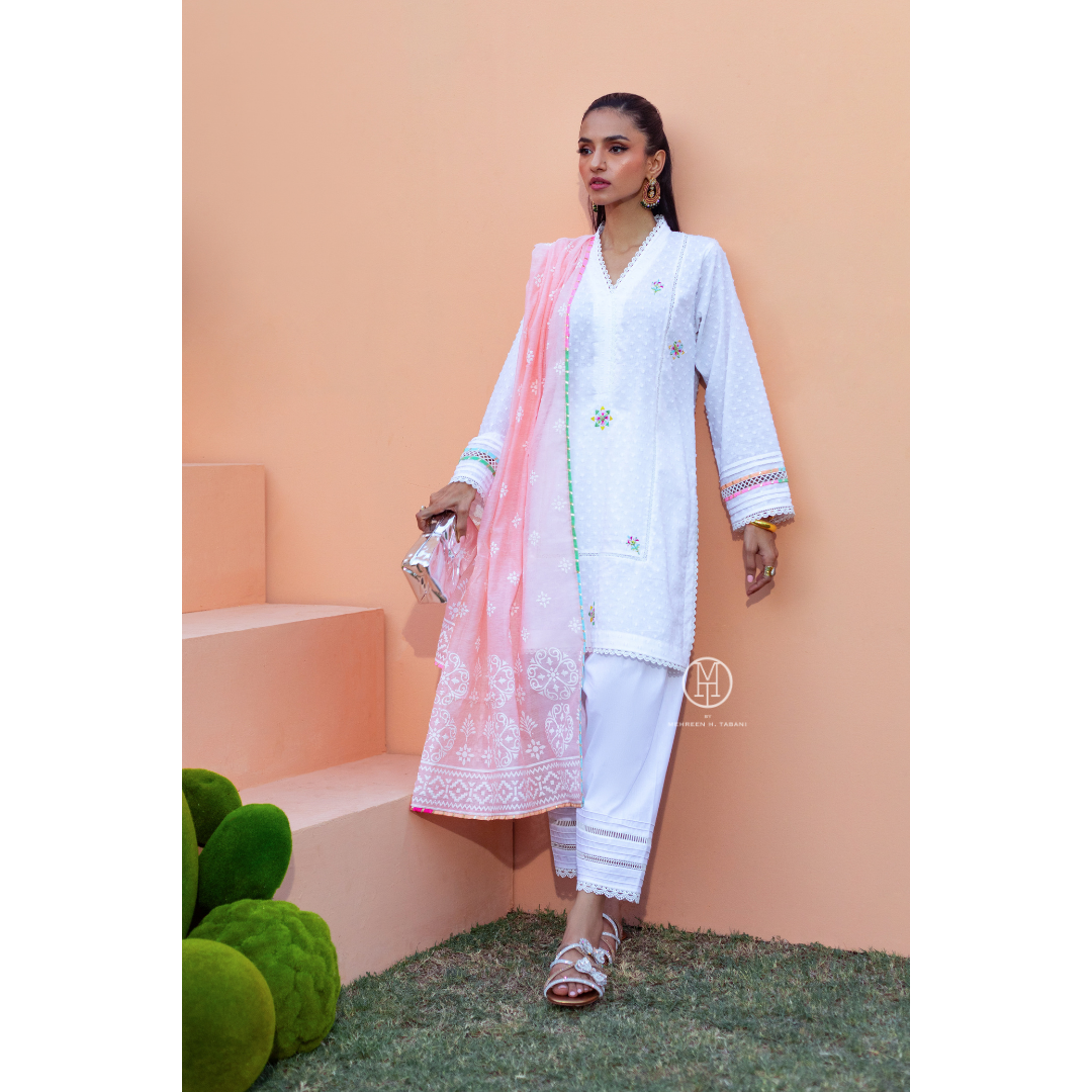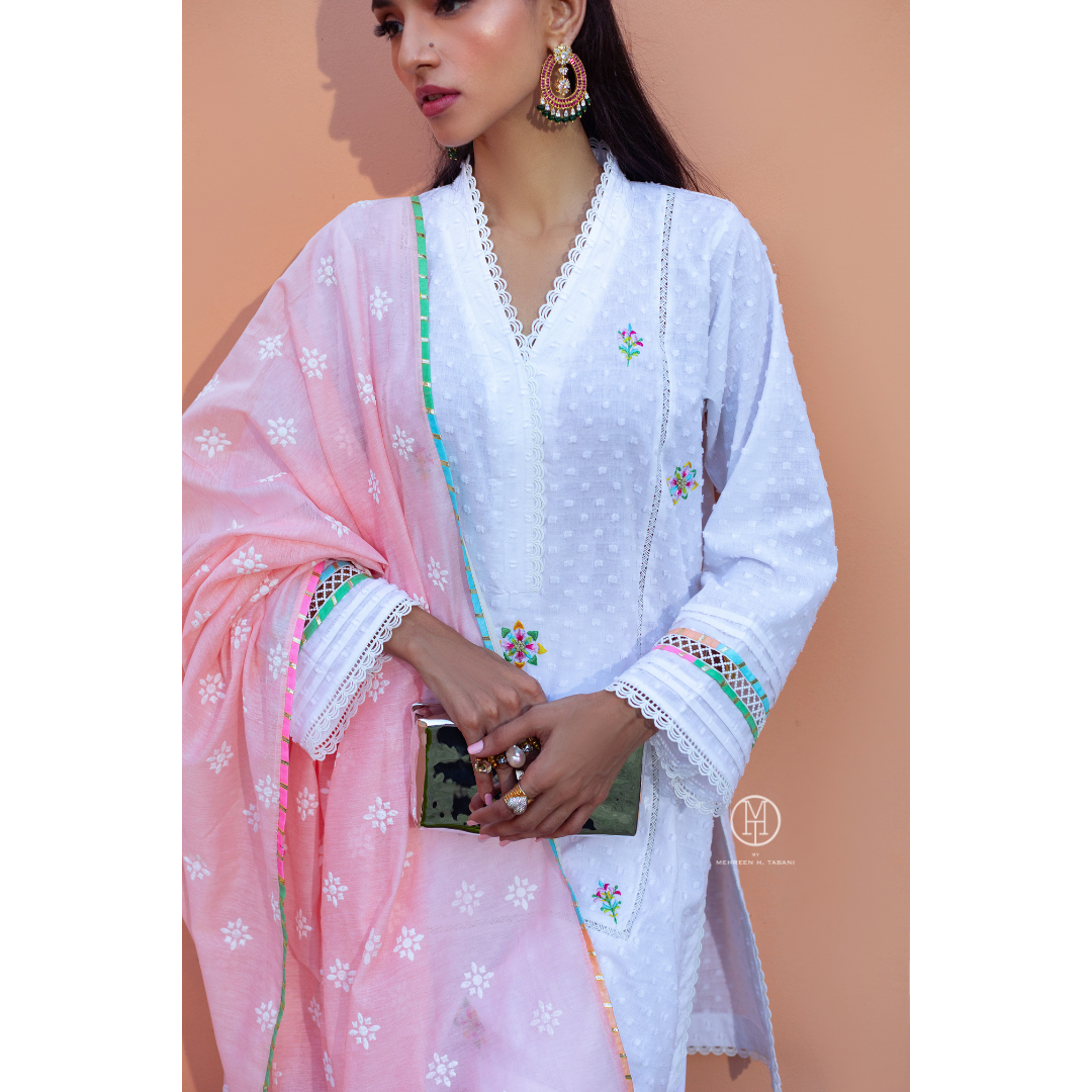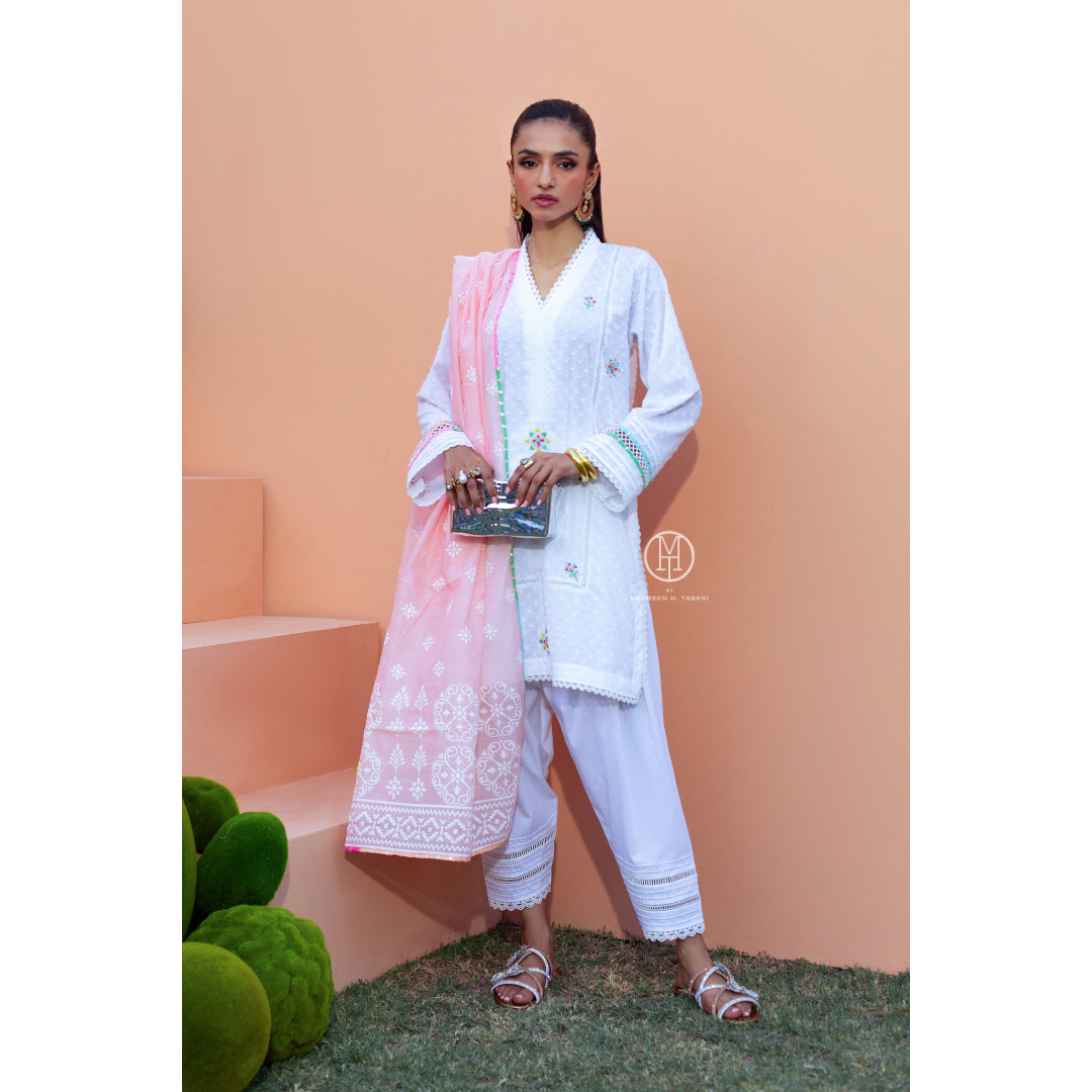Armenia, a breathtaking collection that embodies the vibrant essence of summer—perfect for days spent under the sun and by the sea. This ensemble is centered around a cotton self-embossed shirt that combines classic comfort with striking aesthetics. The shirt is beautifully adorned with intricate resham bootis, adding a pop of color and an element of sophistication to the design. Includes: Shirt Shalwar and Dupatta Colors may vary due to lighting. |