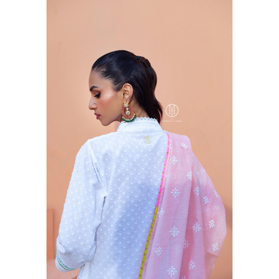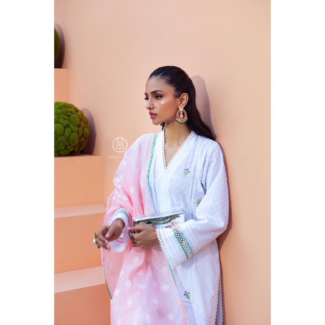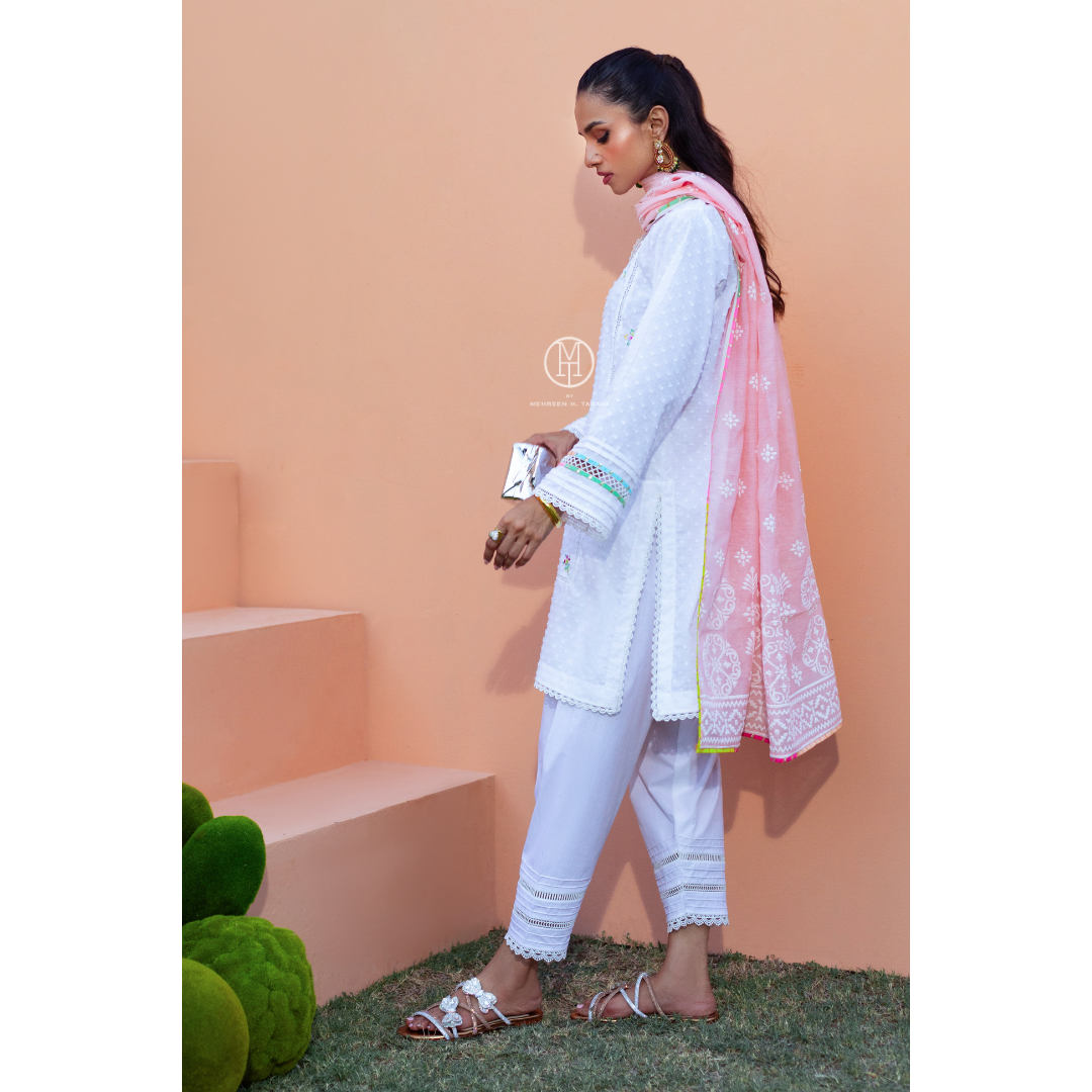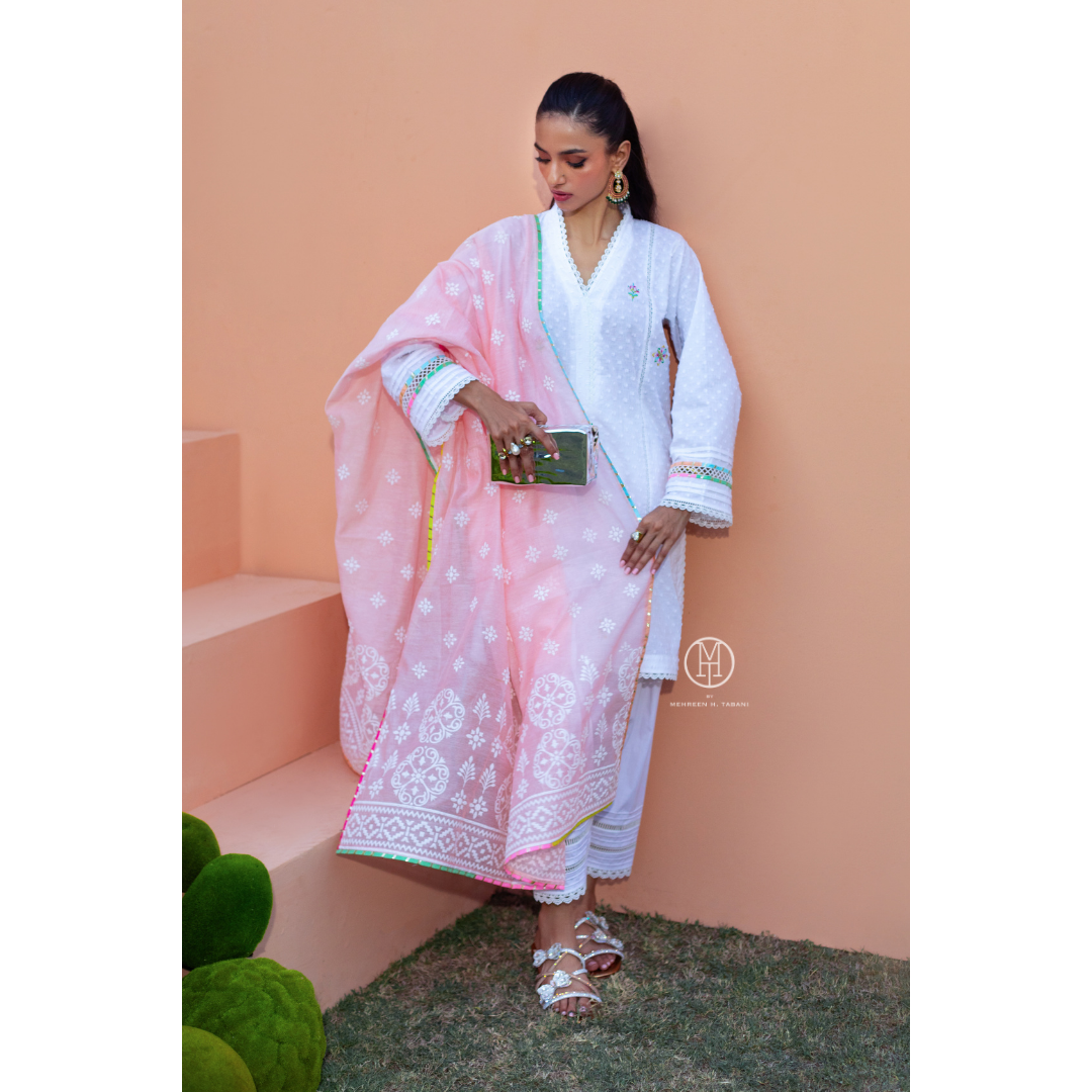 Armenia, a breathtaking collection that embodies the vibrant essence of summer—perfect for days spent under the sun and by the sea. This ensemble is centered around a cotton self-embossed shirt that combines classic comfort with striking aesthetics. The shirt is beautifully adorned with intricate resham bootis, adding a pop of color and an element of sophistication to the design. Includes: Shirt Shalwar and Dupatta Colors may vary due to lighting. |