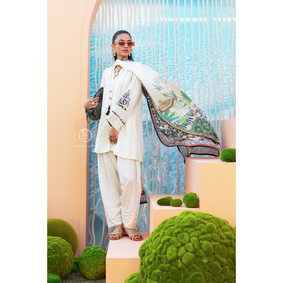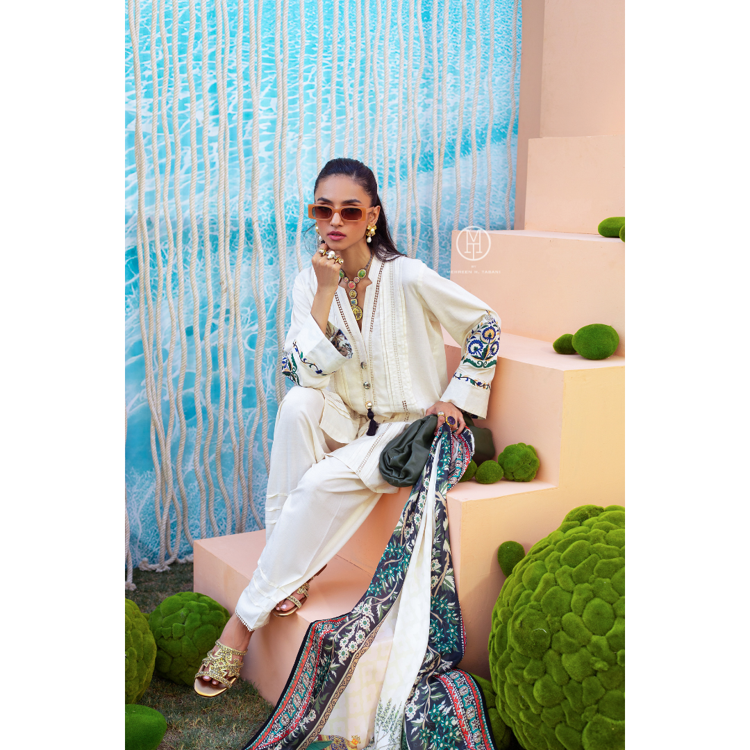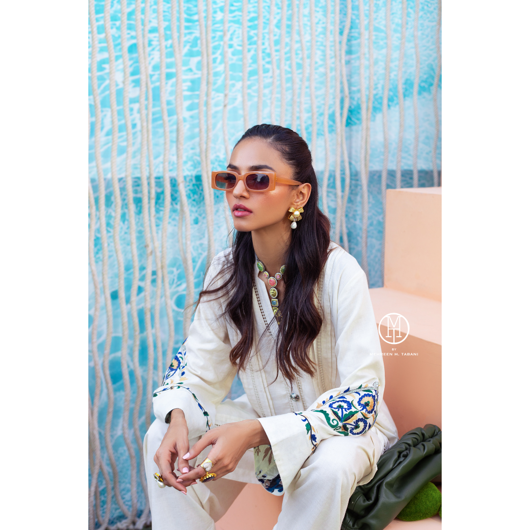 Fleur, a radiant three-piece set that epitomizes the joyful essence of summer, inspired by the allure of beaches and sunny days. This exquisite ensemble features a stylish linen shirt paired with a coordinating shalwar, both crafted to offer comfort and elegance in equal measure. The shirt is adorned with a resham colorful motif on the sleeves, adding a touch of grandeur and intricacy that elevates the overall design.
