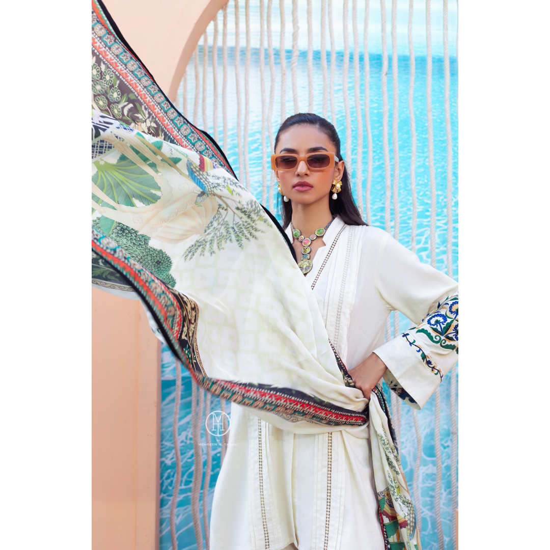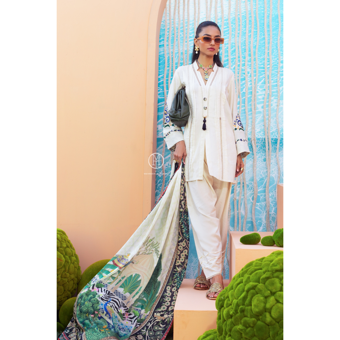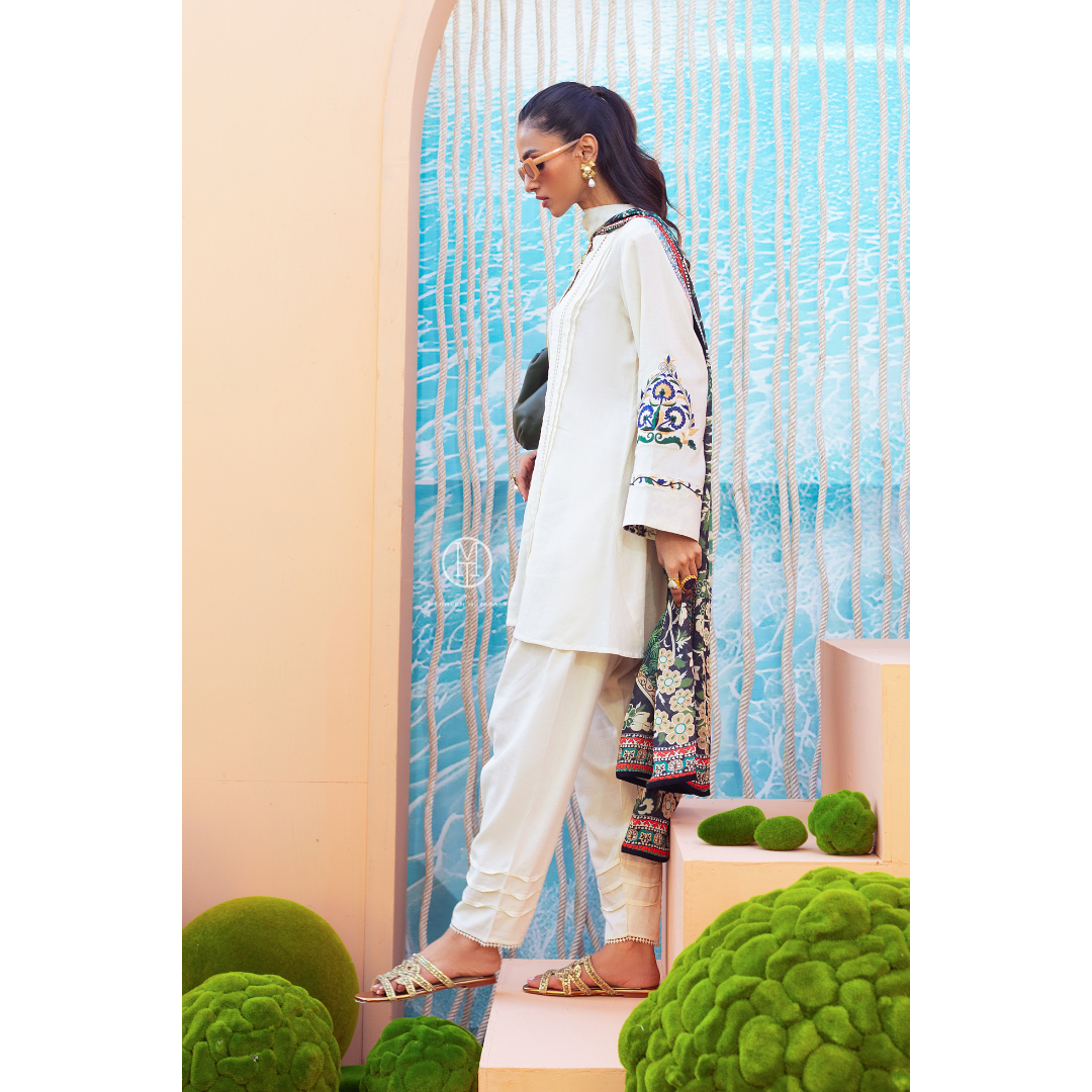 Fleur, a radiant three-piece set that epitomizes the joyful essence of summer, inspired by the allure of beaches and sunny days. This exquisite ensemble features a stylish linen shirt paired with a coordinating shalwar, both crafted to offer comfort and elegance in equal measure. The shirt is adorned with a resham colorful motif on the sleeves, adding a touch of grandeur and intricacy that elevates the overall design.
