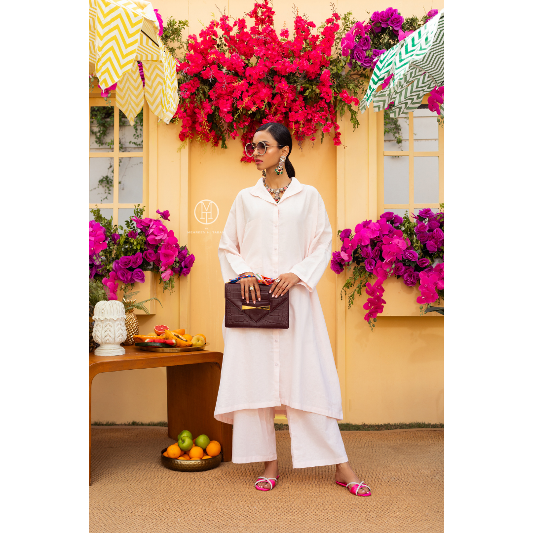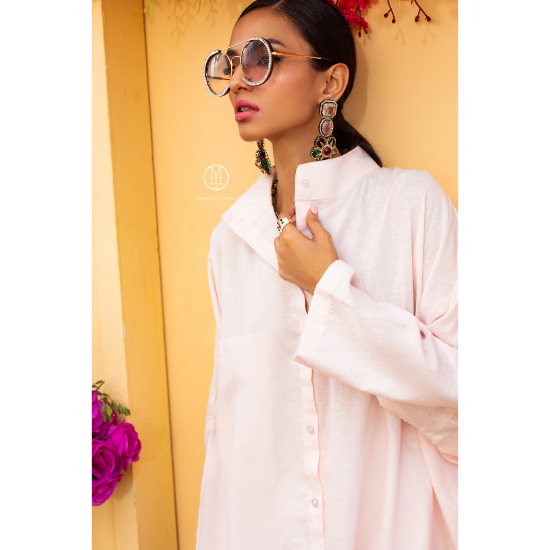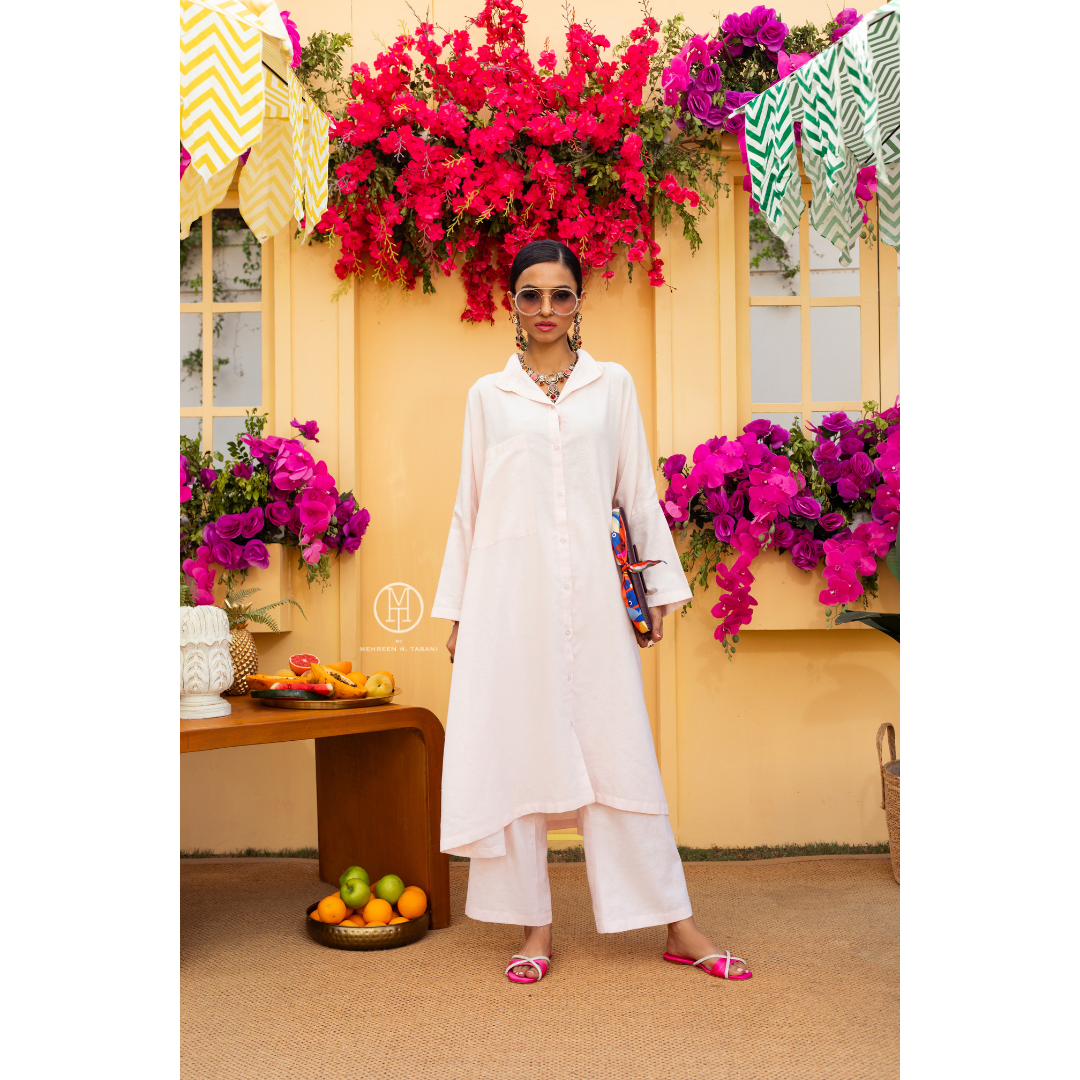 Wispy, a delightful two-piece coord set that embodies the light and airy essence of summer. Crafted in a soft blush pink, this ensemble is a tribute to the gentle hues of summer sunsets and the delicate petals of seasonal blooms. The set features a relaxed, boxy shirt with a broad collar, designed to add a modern twist to the classic silhouette. This shirt’s flared design captures the breeze, making every movement reminiscent of a soft summer wind.