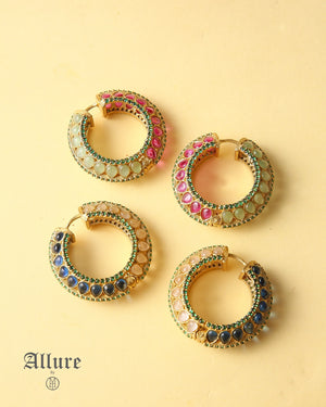 The Mystic Arc features a striking dual-tone design, where semi-precious stones are carefully crafted to mimic real gemstones. They are set in a bold round hoop shape. One side showcases one color, while the other side offers a complementary shade, giving you the versatility of two looks in one. Perfectly balanced between sophistication and modern boldness, these pieces are ideal for making a statement at special occasions. The lightweight design ensures they remain comfortable while adding a distinct, eye-catching touch to any outfit.