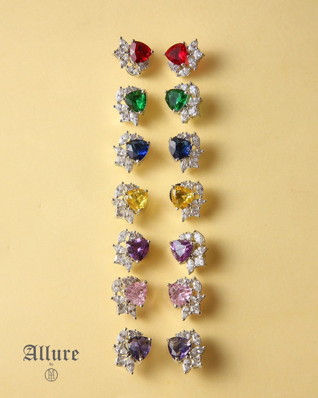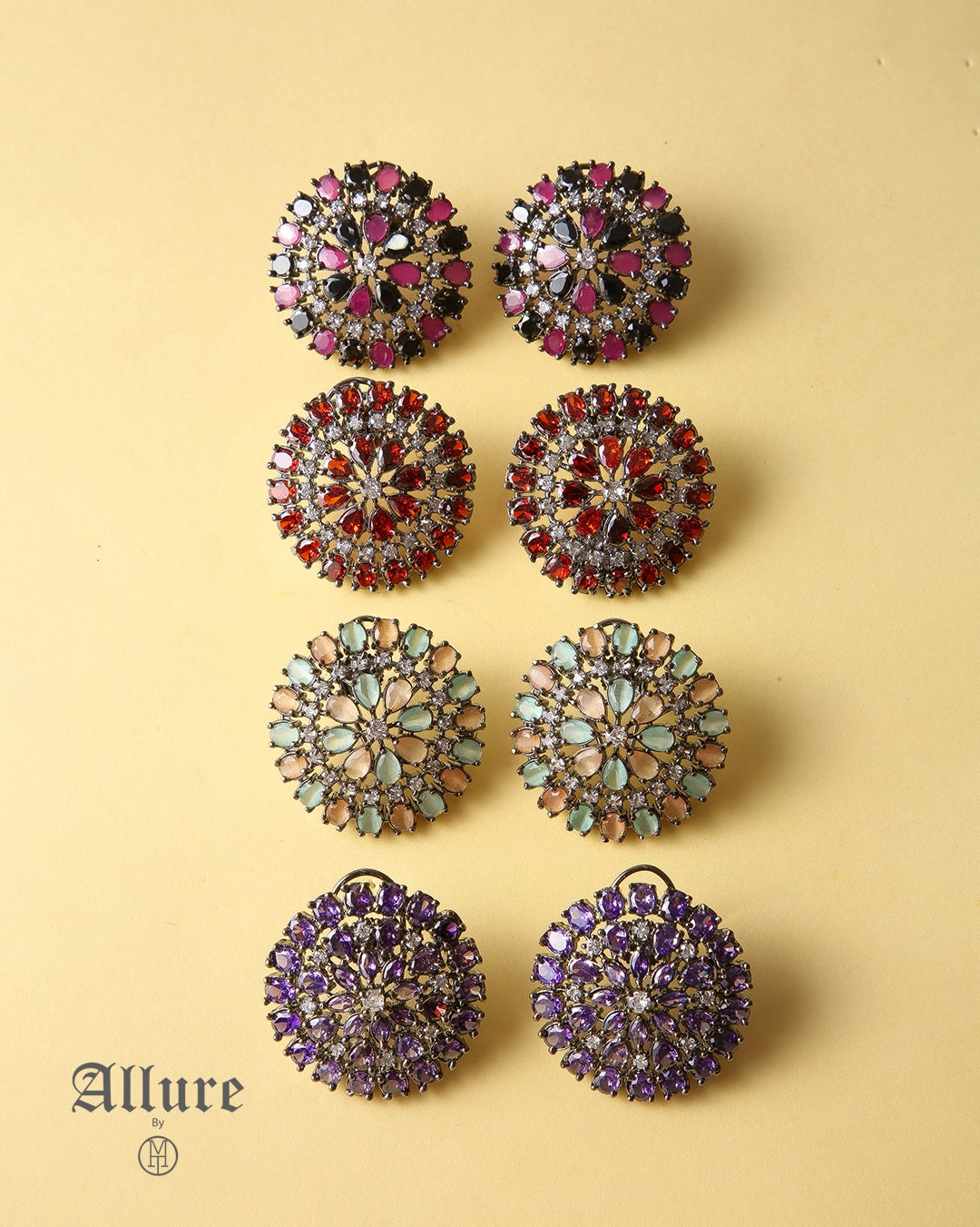 The Luminous Prism showcases the sparkling allure of zircons, paired with plexi stones that mimic the beauty of real gems. A striking mix of vibrant hues—purple, sea green, blue, red, and white—creates a lively and dynamic design that instantly catches the eye. These pieces are designed to add a pop of color and sophistication to any outfit. Perfect for both casual outings and special events, the lightweight design ensures comfort, while the radiant stones provide a bold statement without compromising on elegance.