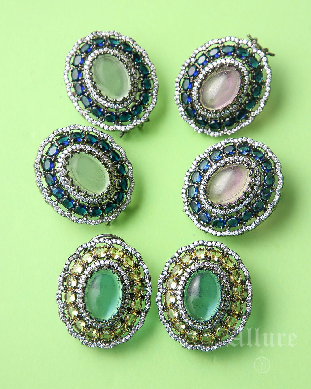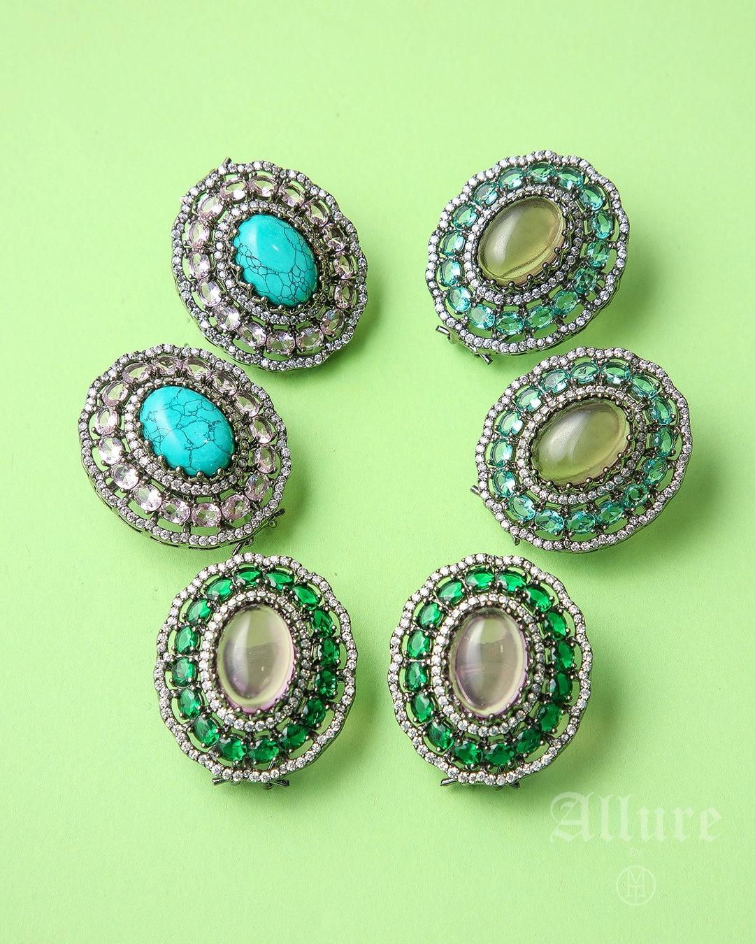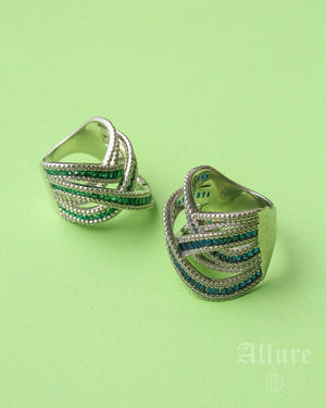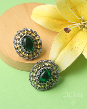 A tribute to royal heirlooms, Regalia features a deep emerald-green cabochon as its heart, set within a delicately sculpted antique-silver lattice. Tiny hand-placed crystals rim the edges, forming a luminous halo that magnifies the gem’s rich green depth. The symmetrical Oval form and finely textured victorian finish give these studs the poise of a vintage court jewel — bold yet wearable for both festive and formal settings.