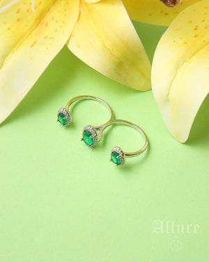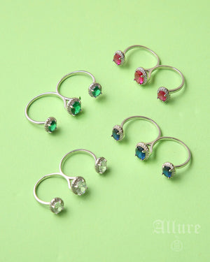 Playful yet refined, Emerald Trio showcases three petite emerald-green stones spaced across slender open bands. The stones are round-cut and bezel-set for a sleek modern finish that allows the vivid green to shine. Lightweight and adjustable, the design celebrates balance and symmetry while bringing a fresh pop of colour to everyday styling.