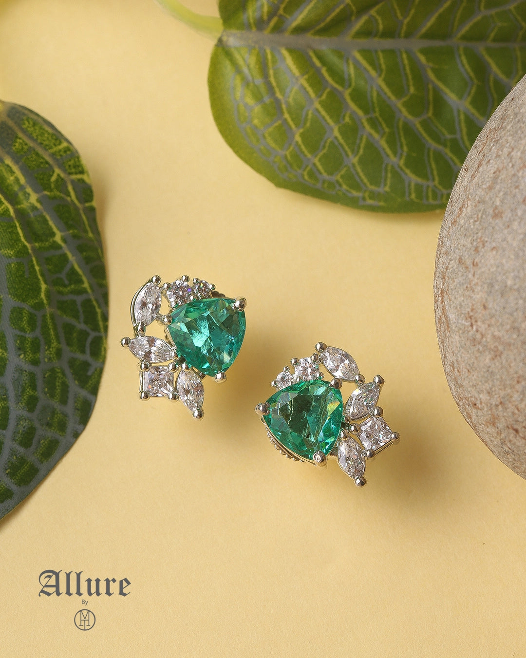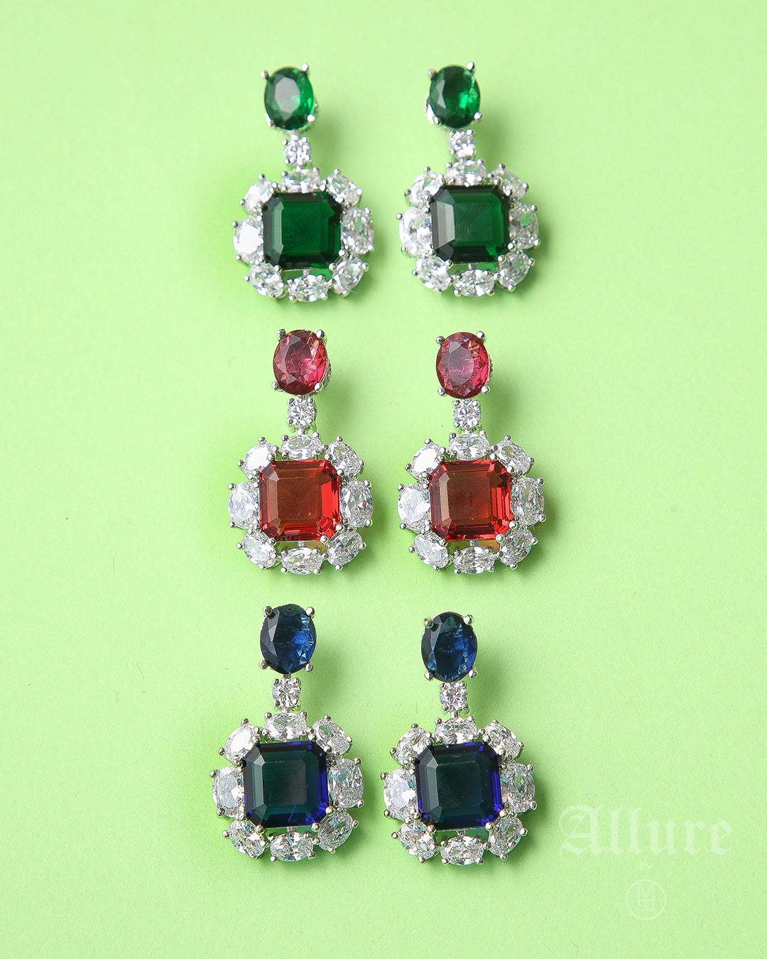The Céleste earrings celebrate celestial grace with their elongated emerald-cut stones of rich green hue, suspended gracefully from the ear. Surrounding each centre stone is a precise halo of brilliant-cut Zircons that catch light like a constellation in orbit. The drop silhouette elongates the neck elegantly, while the crisp facets and mirror-polished prongs echo the clarity of starlight on a midnight sky.