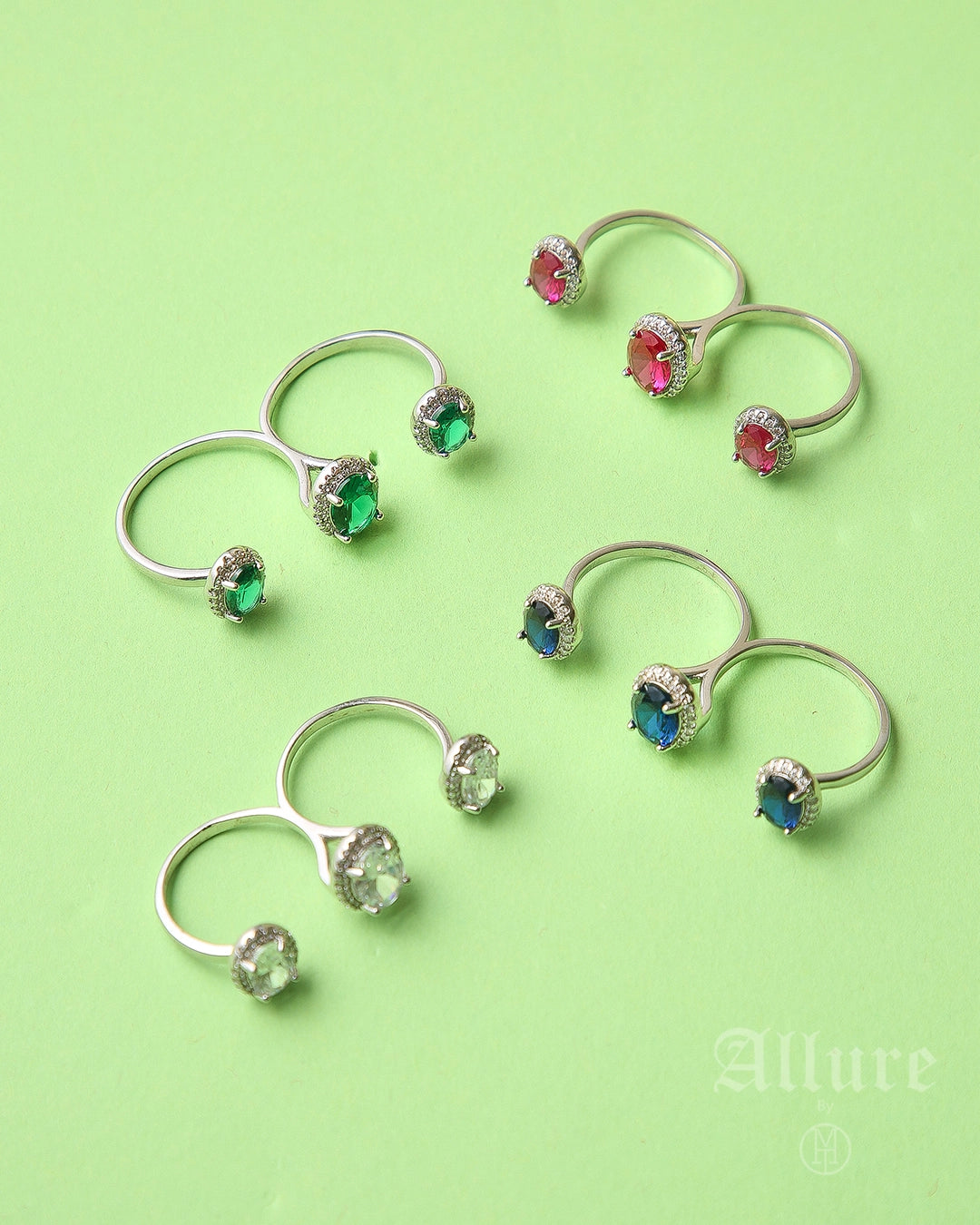 Inspired by the tranquillity of lush gardens, Allure Eden showcases olive-green and lemon-yellow cabochons arranged in an organic floral pattern. Each smooth cabochon is prong-set to reveal its natural glow, while the subtly curved antique silver (victorian) base evokes tender petals cradling dew-kissed blooms. This design reflects the harmony of fresh foliage and soft spring florals, adding a lively yet sophisticated accent to any ensemble.