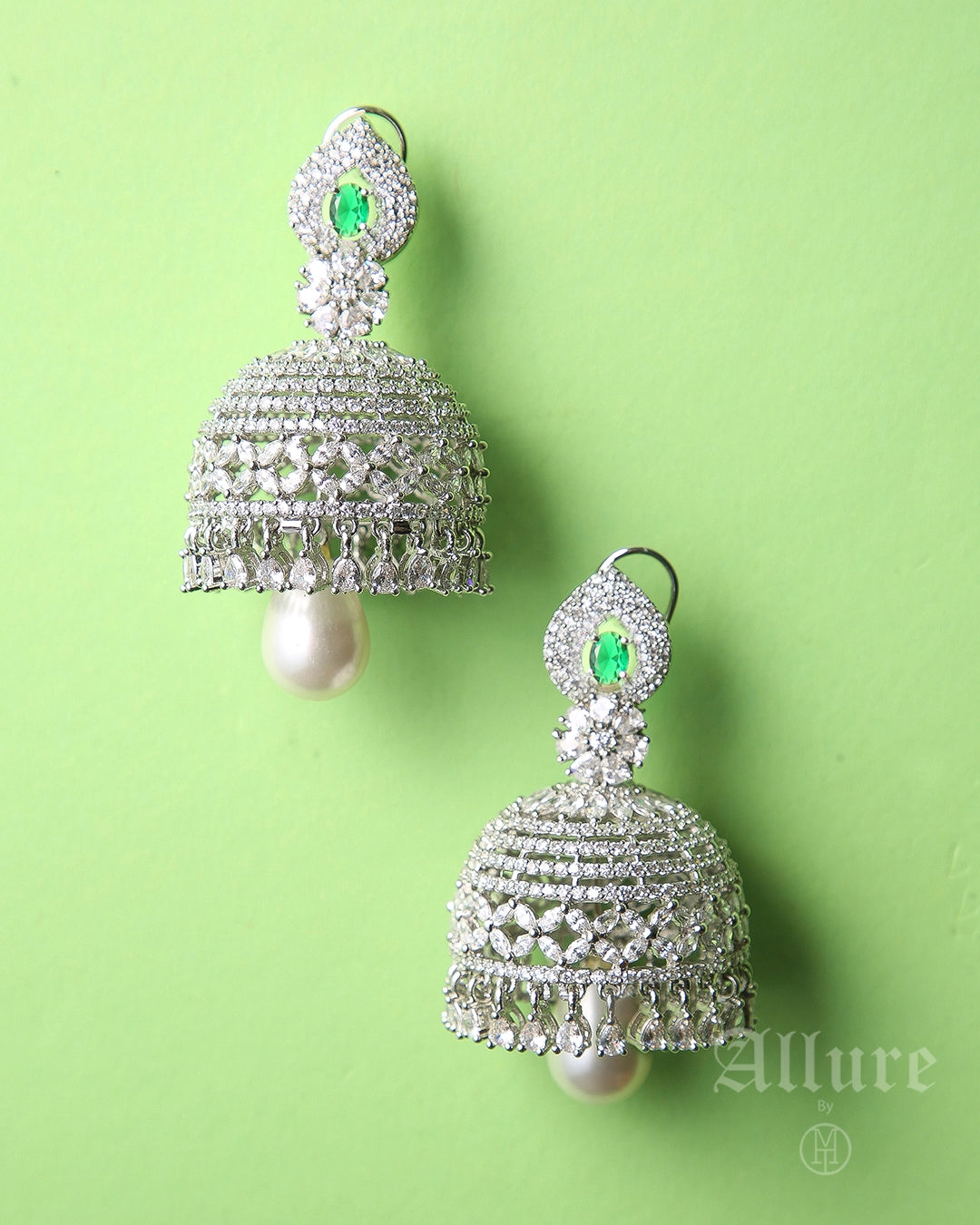 Honouring South-Asian heritage, Heirloom Noor showcases intricately filigreed jhumka-style domes fully encrusted with pavé crystals, crowned with a petite emerald accent. A single white pearl drop hangs beneath each dome, adding a classic finish that nods to traditional heirloom earrings. The meticulous latticework and contrasting textures embody artisanal craftsmanship passed down through generations.