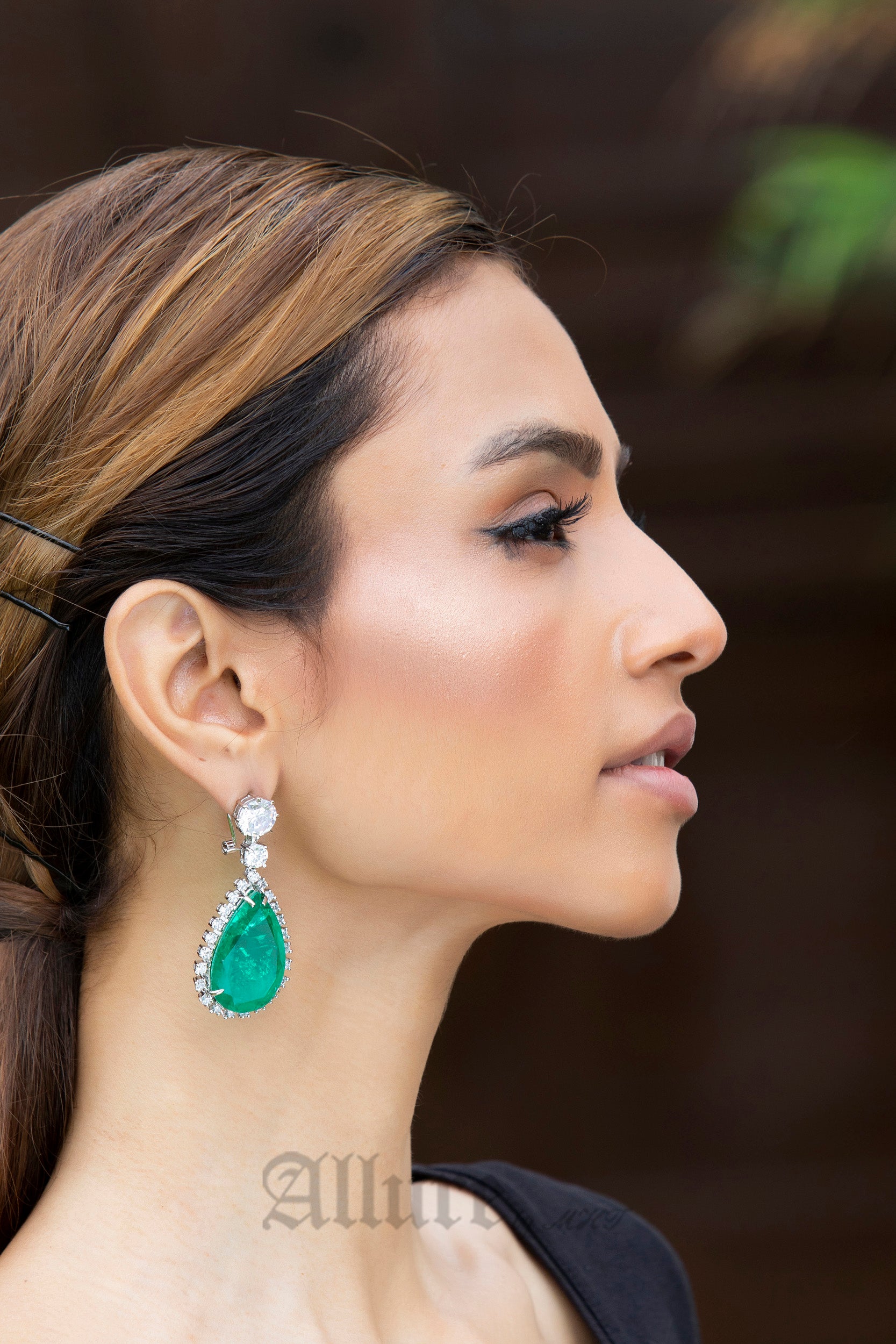 A mordern pair of diamond inspired earrings with Zirconia and an oversized teardrop colored jade that makes a breathtakig statement.