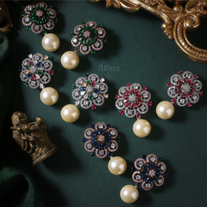 A cluster of colored stones set like a flower finished with a teardrop pearl.