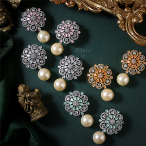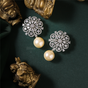 A sun inspired design with a pearl center and zirconia set intricately like rays