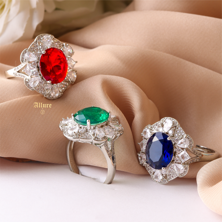 a stunning ring, adorned with a gleaming rhodium plating that exudes luxury. Intricately placed zircons enhance its allure, while an oval-shaped colored jade steals the spotlight at the center, creating a mesmerizing focal point with its rich hue and elegant presence.