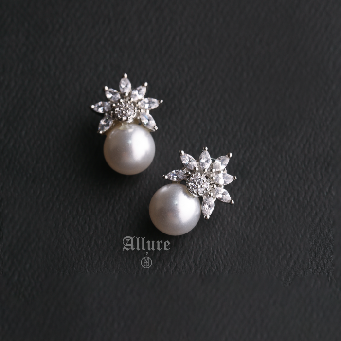 An exquisite pair of earrings featuring a delicate floral zirconia top that sparkles with every movement, paired with a lustrous faux pearl drop.