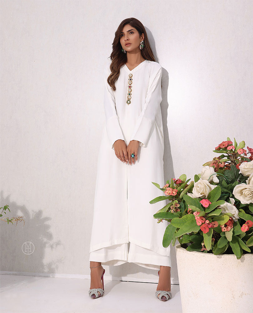a flowy, easy breezy kaftan inspired A-line georgette shirt with relaxed pants that drapes effortlessly. Paired with a jeweled neckline with gota and polki embellishments by our skilled artisans, accentuated with meticulous stitching that makes this dress a simple yet luxe statement 🌟