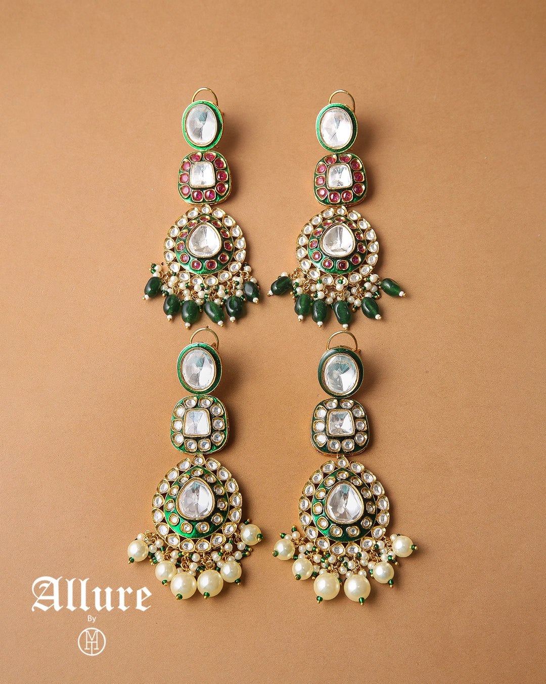 True to its name, Tara Glow catches the light like a star in motion. The design layers Polki work with deep-toned meena stones, finished with cascading drop beads that add movement to every step. Measuring four inches in length and carrying a reassuring weight, these earrings are built for occasions where it’s all about grace – a baraat jora with a worked dupatta, a mehndi night with bold colours, or a Chand Raat outfit finished with gold accents. The red-and-green pairing keeps the look rooted in classic wedding palettes, while the craftsmanship ensures it stands apart in detail.