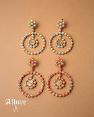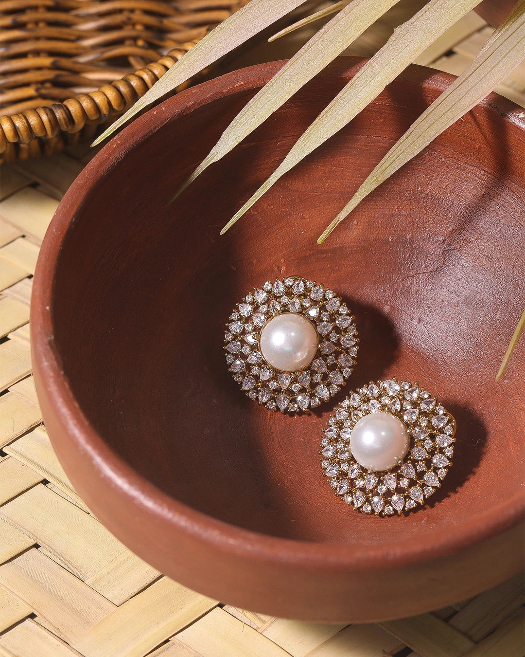 Derived from Zehra – a name that evokes radiance, femininity, and floral symmetry, these circular studs echo the shape of a full bloom in mid-spring. At the center: a dome of pearl, peach, or green resin that anchors the design. Around it, precise clusters of CZ stones form a sparkling petal-bed set in dull gold. Light bounces from every angle, yet the silhouette remains grounded and regal. Whether you’re dressing for a daytime daawat, or a night-time gathering, this is the kind of jewel that enhances your style.Layer it with a silk kurta or a handwoven dupatta, and let this pair quietly exalt your entire look.