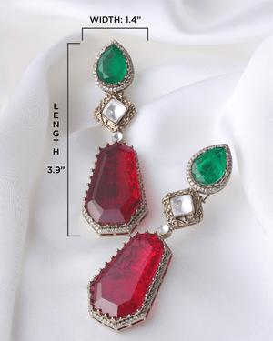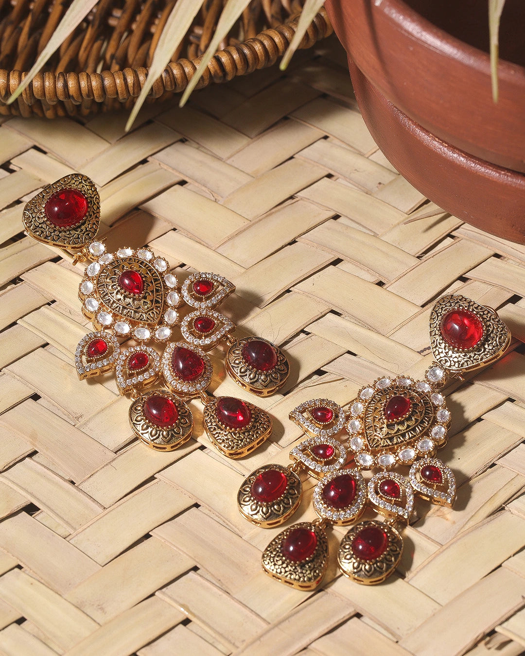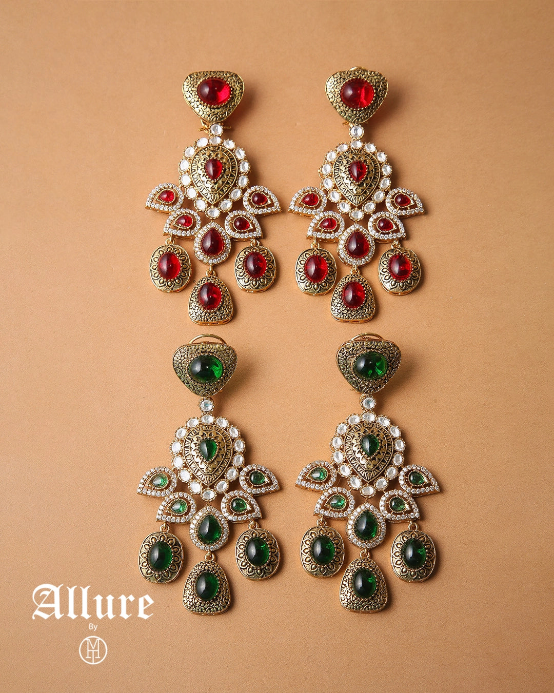 Zayrah Chand takes its name from the moon, capturing its fullness and brilliance in a heritage-inspired silhouette. The earrings open with a bold central stone at the stud, framed in antique gold-toned detailing, and flow into a layered chandelier of teardrop and marquise cuts bordered with glistening crystals. Each drop is arranged to create generous movement, catching the light with every turn of the head. Available in deep red or rich green, these earrings bring a regal presence to your look – whether paired with an Eid jora, styled with a mehendi ensemble, or worn to a wedding daawat. The ornate design and substantial form ensure they remain the statement piece in any setting.