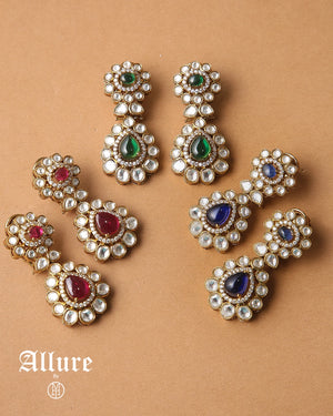 Sana; a name that speaks of radiance and celebration, finds its form here in a pair of ovals that frame the face with quiet strength. Each piece is built around a ring of polki, holding the depth of ruby, the calm of sapphire, or the vitality of emerald green. The colours shift the story: red for a moment steeped in tradition, blue for evenings that call for composure, green for gatherings full of life. Balanced in weight and proportion, they transition with ease from wedding lights to the soft glow of a daawat table.
