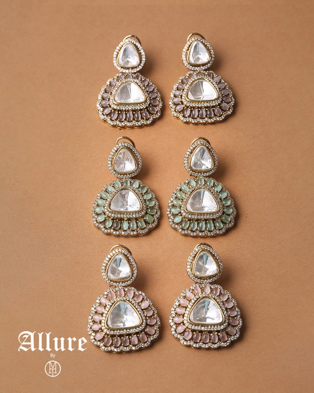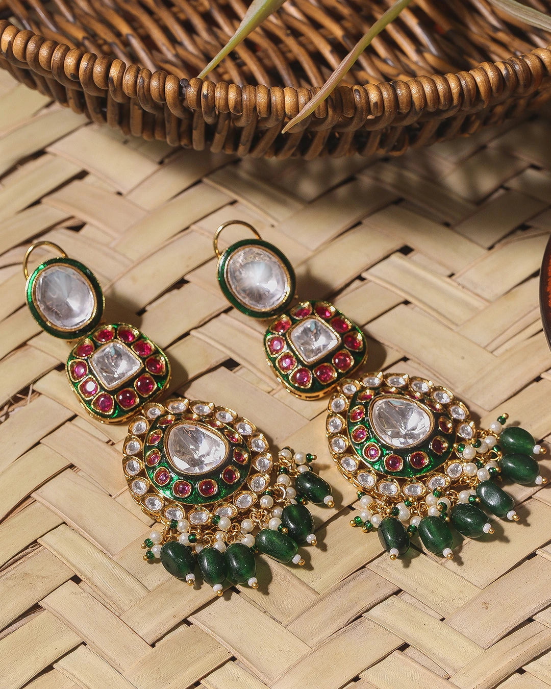 Channeling old-school opulence, Gulnaar is a tribute to vintage Mughal splendor. With a bold colored jade centerpiece framed by a halo of uncut-style polki stones, these earrings exude timeless luxury and cultural richness.