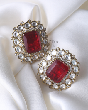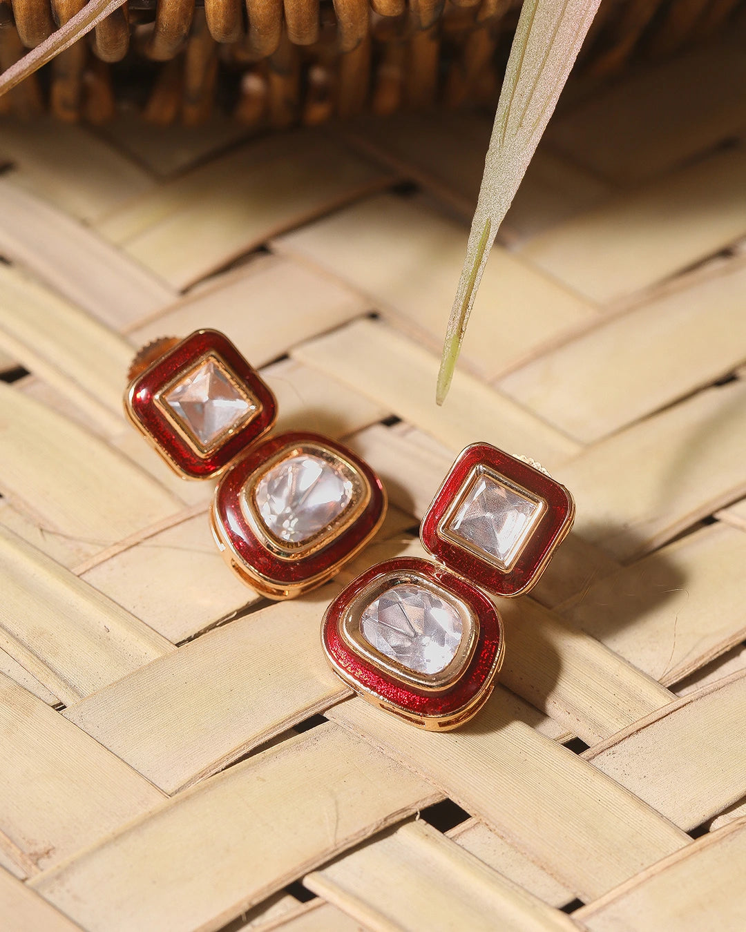 Meena Square is named for what it carries: the geometry of a sharp cut, and the subtle detailing of meena kari work, finished in gold and Polki Kundan. These are pieces that don’t stretch for attention. Instead, they hold their own with proportion and polish, offering colour without clutter. The compact square makes them easy to pair with a wide neckline, an organza dupatta, or something richer for shaadi season. Available in red, green, black, or blue, each shade adds just enough, without competing with the rest of your look.