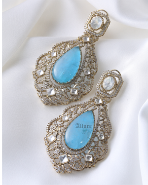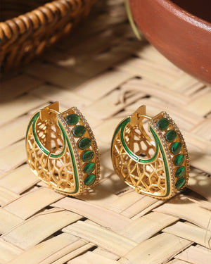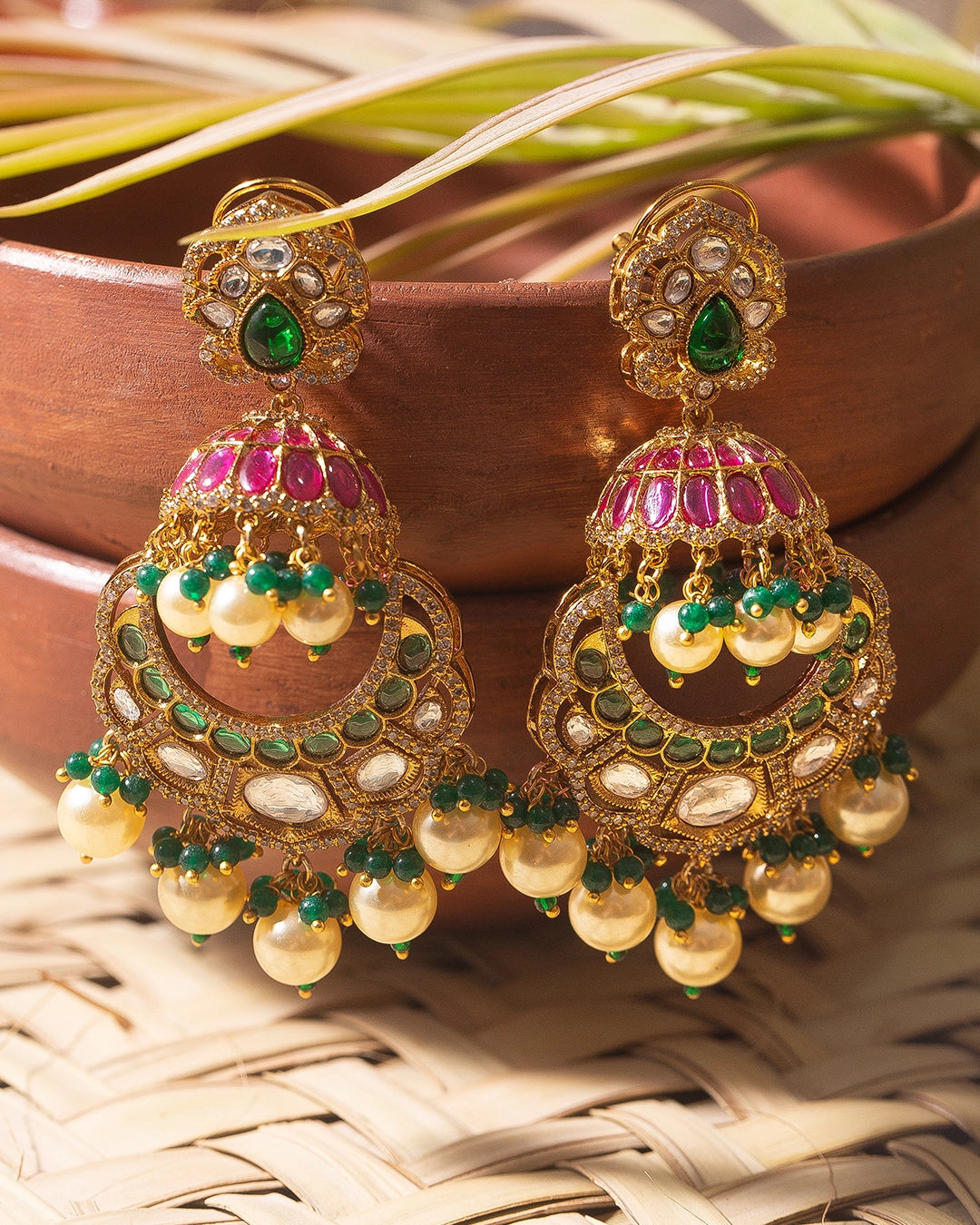 Zareen takes its name from gold, shaped into a pear-lined silhouette with a dome-centred top handset in kundan. Each bezel is edged with zirconia for clean highlights that read well in evening light. Offered in red, green, or blue enamel varieties, the design finishes with an oversized kundan pear drop for a soft, steady sway at walima, mehndi, or baraat gatherings.
