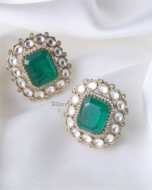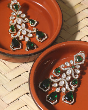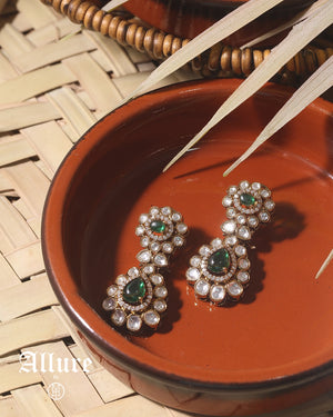 Gracefully bold and utterly regal, Noorani from our Heritage collection is where grandeur meets craftsmanship. Featuring a luminous emerald-cut stone set in a floral halo, the design cascades into a pavé sphere encrusted with glistening green and white crystals. The antique gold detailing adds an old-world charm, making Noorani a stunning choice for weddings, festive galas, or a heritage heirloom.