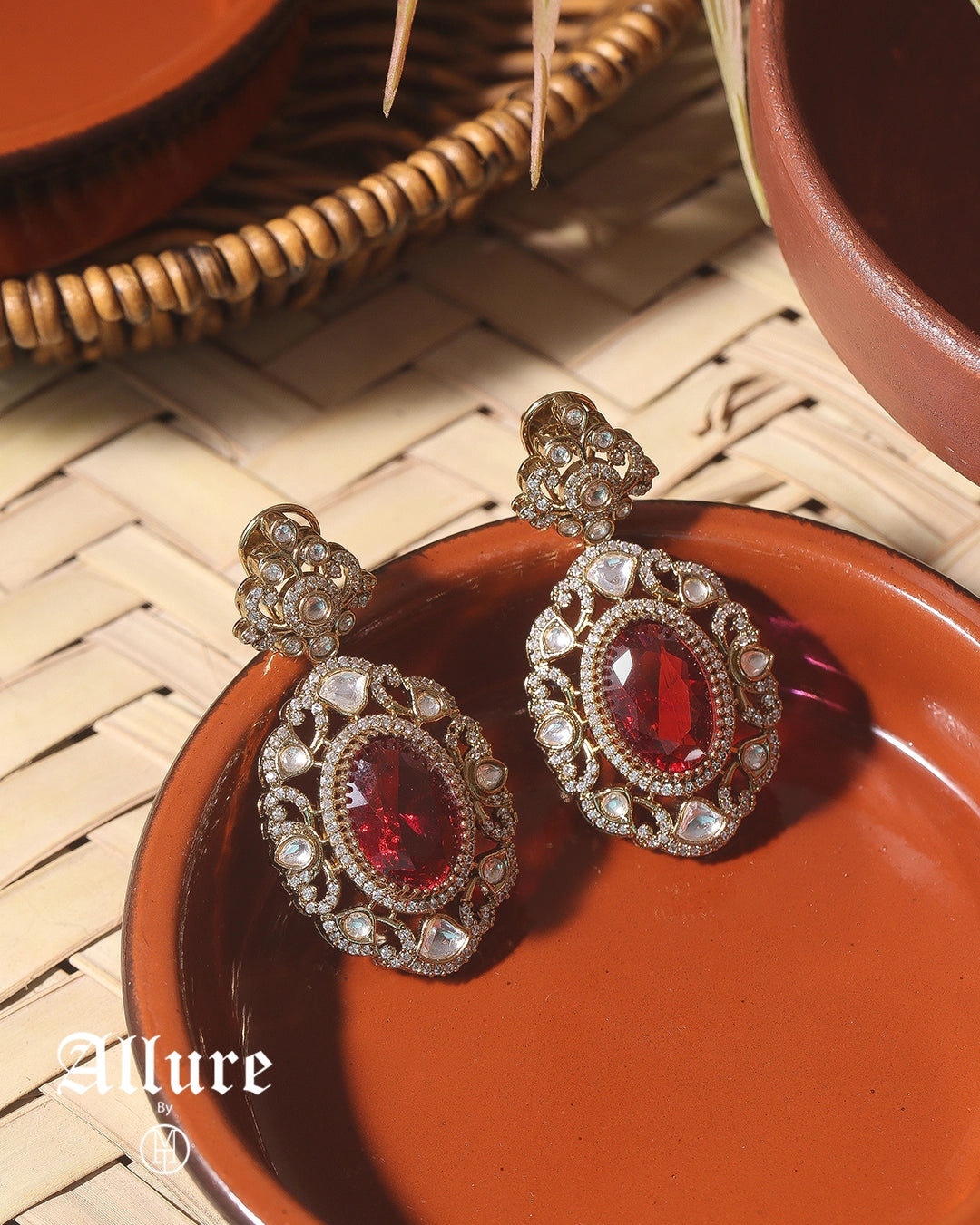 Named for the drop it resembles, Elan Boond is a study in small, striking design. Set in a gold-plated base and accented with colour-rich stones in red, green, or white, each piece carries presence through shape and shine alone. The silhouette is short and curved, designed to sit neatly on the lobe while catching the light with every turn. Pair it with a churidar set for dholki, wear it with a classic saari at a nikkah, or let it add polish to a silk kameez on Eid. It’s made for occasions where elegance lies in restraint.