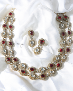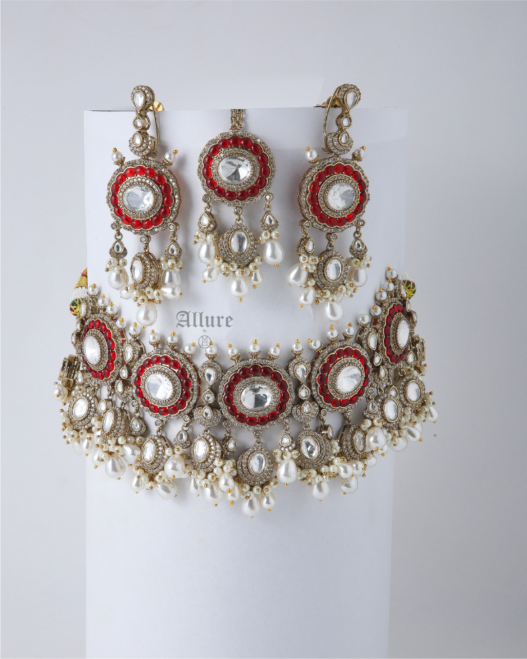 Zari Karaa redefines traditional grandeur with timeless artistry. Adorned with glistening uncut stones and striking ruby-toned centerpieces, this masterpiece from our Heritage range captures the essence of royal elegance. The intricate arrangement of kundan and pearl-inspired details adds a layer of vintage charm, making it a perfect heirloom-worthy piece.