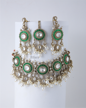 A poetic tribute to royal legacy, Gunwah is an ode to old-world charm. This exquisite set from our Heritage range showcases intricate circular motifs adorned with fine detailing and delicate pearl accents. Paired with statement earrings and a maang tikka, it radiates regal elegance with a touch of festivity.