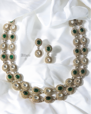 Understated yet undeniably regal, Nazneen is an ode to timeless grace. Featuring dual rows of meticulously set oval stones framed in intricate detailing, the set offers a refined elegance perfect for both day and evening wear. The matching earrings echo the necklace’s charm, creating a cohesive and graceful silhouette.