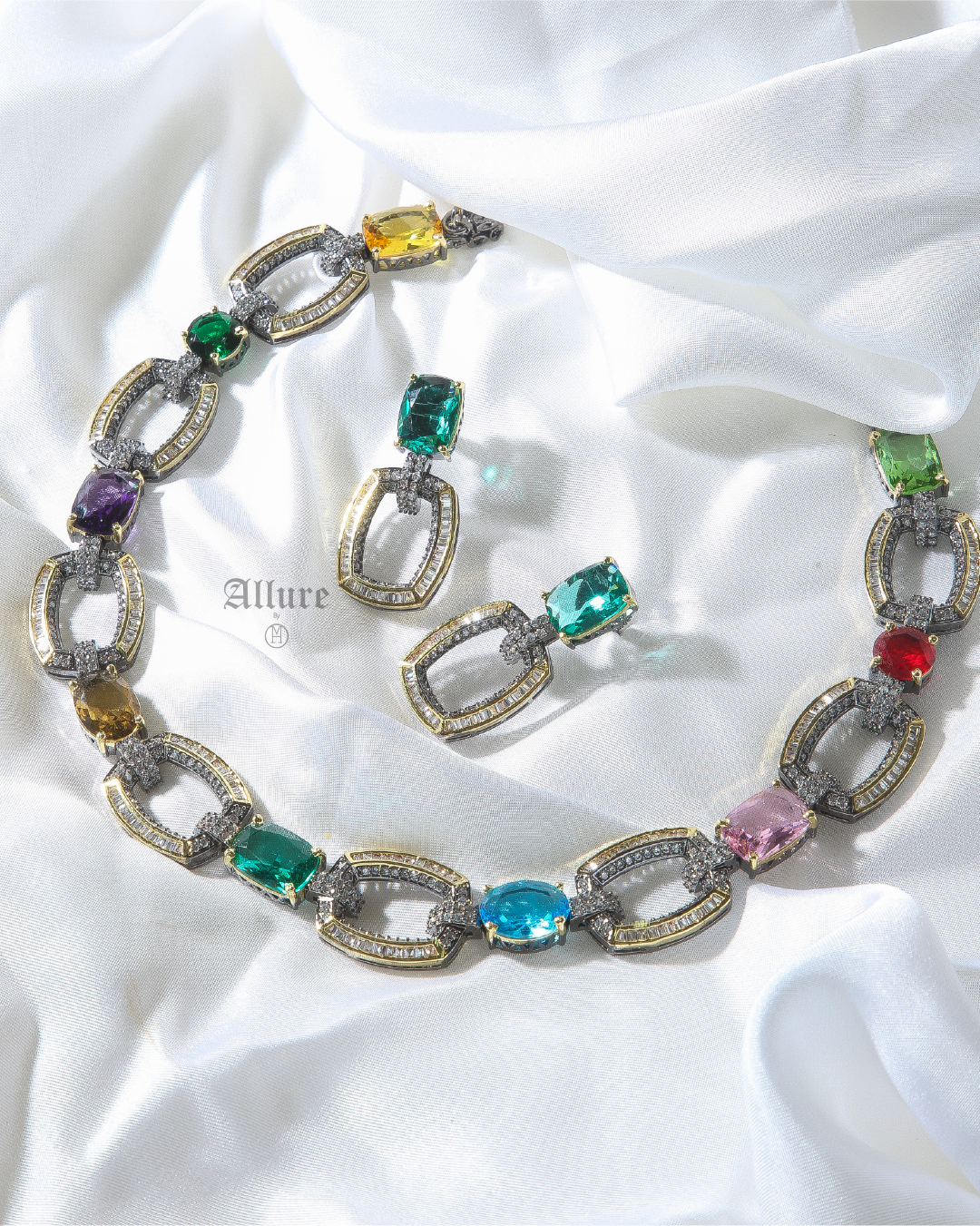 Vivid, vibrant, and irresistibly regal—Rangmahal from our Heritage range is a celebration of color and charisma. Each gemstone is thoughtfully paired with a diamond-studded link, creating a rhythmic composition that blends tradition with bold expression. The matching earrings echo the same symphony, adding elegance to every movement. Ideal for festive soirées or statement moments, Rangmahal is crafted for the woman who embraces heritage with a hint of modern flamboyance and a whole lot of flair.