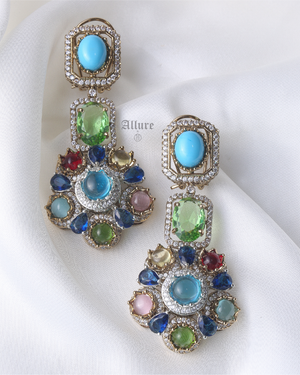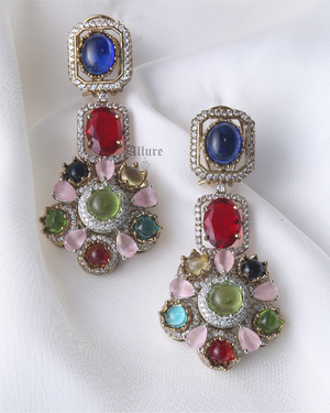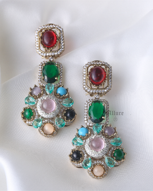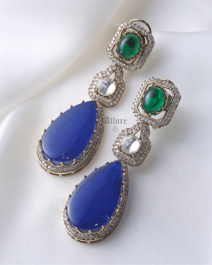 From Meera’s Classic collection comes the Chromatic Drops – a design that lets the brilliance of stones take center stage. Inspired by the fluidity of falling rain, each drop-shaped stone is bordered with delicate work, adding just enough color to frame their natural shimmer. The stones sit in a graceful vertical cascade, their organic shapes catching soft light with every glance, making them just as fitting for a daytime gathering as for an evening celebration. Available in blue, red, and green, these earrings balance understated elegance with a hint of festivity.
