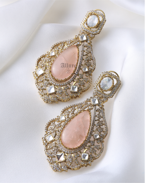 Delicate, divine, and dripping with grace — Sahiba from our Heritage range is a whisper of royalty in soft blush tones. A pear-cut quartz centerpiece rests within an intricate filigree frame adorned with kundan-inspired stones and glimmering crystals. Its antique gold setting adds a touch of old-world elegance, making Sahiba the perfect pick for day weddings, festive soirées, or regal gifting.