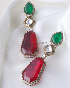 A celebration of colour and craft, Lara Jhoom brings together the brilliance of polki kundan with the vibrance of red, green, and white stones. Each piece begins with a floral stud, moving into a tiered drop where every stone is hand-set in warm antique gold. The precise arrangement and balanced proportions (3.2" length, 1.5" width) give it a graceful movement and striking presence. Perfect for mehendi evenings, shaadi looks, or festive daawats, these earrings carry the richness of heritage jewellery into today’s celebrations without losing their evergreen charm.