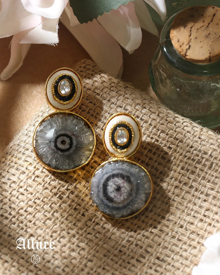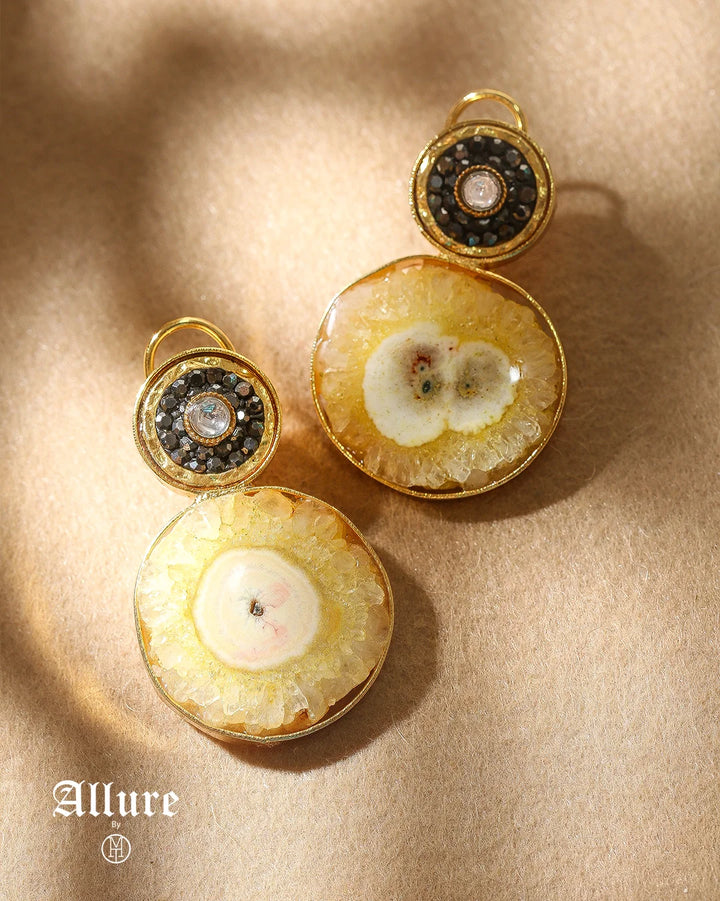 Where quiet power meets everyday allure. These compact studs pair a fluid silhouette with moody Solar Quartz crystals in hues of blue, green, purple, yellow, and teal. Inspired by the celestial beauty of twilight and the mystery of an eclipse, they bring a subtle glow to both denim days and silk nights, making drama feel effortlessly wearable.