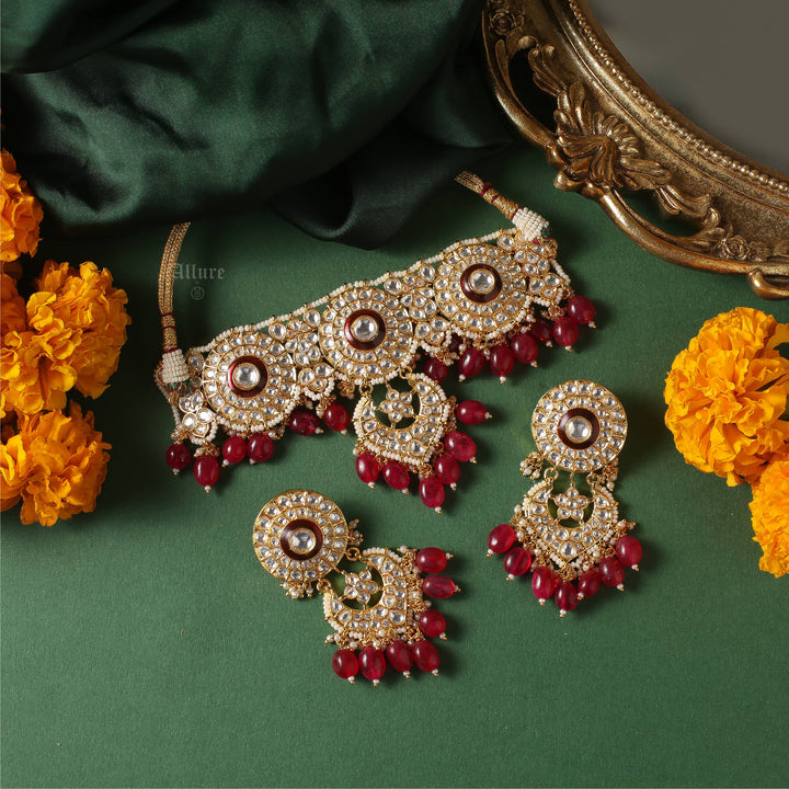 A chunky polki choker set with enamel that offers an enhanced regal look. Paired with earrings with hanging beads, the set is a must have.
