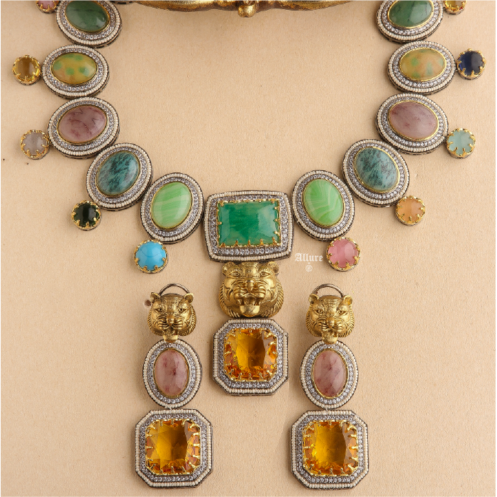 A grand necklace fit for a Raani, adorned with marbled pastel stones and Zirconia on a metallic base. Featuring an extravagant pendant with lion murals and champagne colored jade surrouded amidst Zirconia.  It’s paired with three-tiered earrings, crowned with a lion mural and colored stones. This set makes a majestic statement. 1. Due to the delicate nature of our jewelry, we regretfully cannot accept returns or exchanges. 2. Meticulously crafted using high-quality alloy, adorned with radiant gold/rhodium plating. 3. To maintain its allure, kindly refrain from contact with perfume or water. 4. Handle with care to keep your jewelry looking flawless over time. 5. Crafted to replicate the charm of fine jewelry without the high cost. 6. Created to be gentle on sensitive skin, offering both style and comfort. 7. Store in provided pouch or box to prevent damage and tangling. 8. Store in an airtight container to protect against tarnishing. |