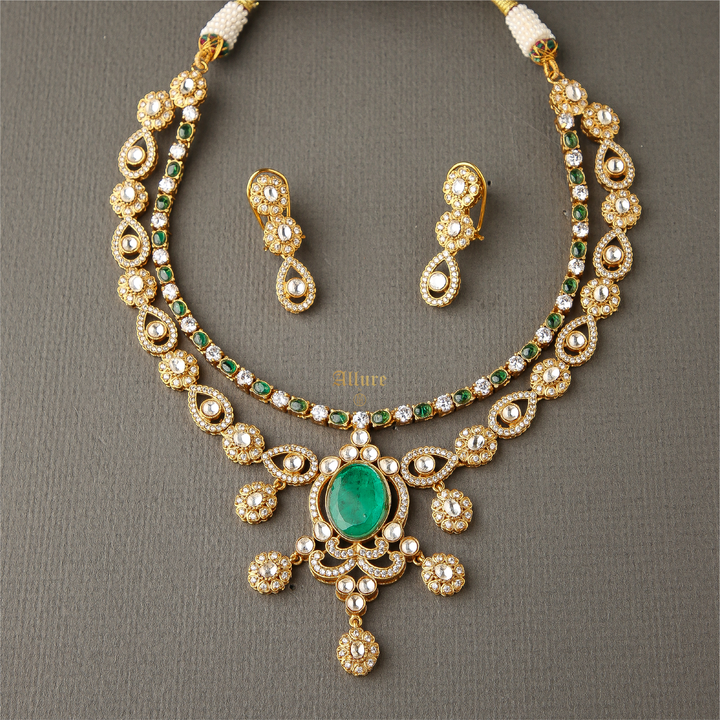 a polki two tiered necklace with a  colored jade in the center and matching earrings that looks ethereal.