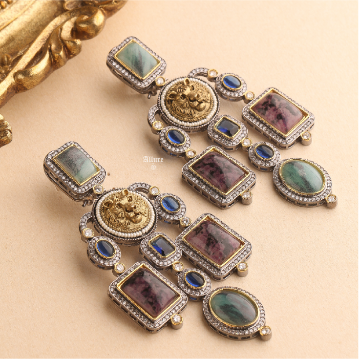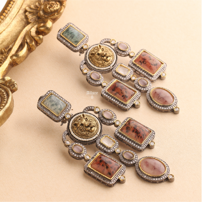 Chandelier-inspired earrings adorned with sparkling Zirconia and pastel-colored jades. Featuring a bespoke lion mural, these earrings add a touch of regal style to your look, capturing the essence of heritage elegance   1. Due to the delicate nature of our jewelry, we regretfully cannot accept returns or exchanges. 2. Meticulously crafted using high-quality alloy, adorned with radiant gold/rhodium plating. 3. To maintain its allure, kindly refrain from contact with perfume or water. 4. Handle with care to keep your jewelry looking flawless over time. 5. Crafted to replicate the charm of fine jewelry without the high cost. 6. Created to be gentle on sensitive skin, offering both style and comfort. 7. Store in provided pouch or box to prevent damage and tangling. 8. Store in an airtight container to protect against tarnishing |