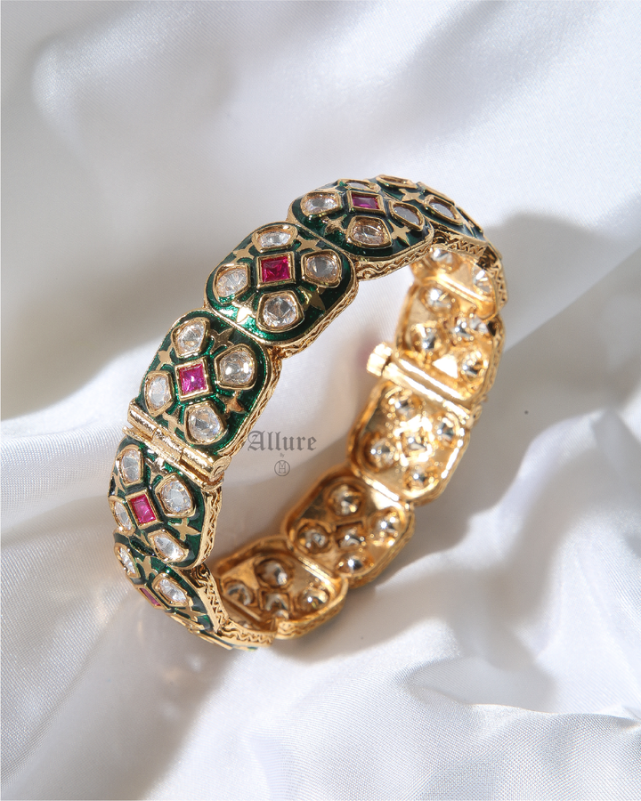 An ode to timeless artistry, Amisha Karaat brings royal elegance to your wrist. Handcrafted with intricate detailing, it features traditional enamel work, uncut stones, and a vibrant pattern that evokes regal charm. Each segment is a nod to the craftsmanship of a bygone era, making this bangle a perfect heirloom piece. Whether worn solo or stacked, Amisha promises to elevate any ethnic ensemble with effortless grace.   1. Due to the delicate nature of our jewelry, we regretfully cannot accept returns or exchanges. 2. Meticulously crafted using high-quality alloy, adorned with radiant gold/rhodium plating. 3. To maintain its allure, kindly refrain from contact with perfume or water. 4. Handle with care to keep your jewelry looking flawless over time. 5. Crafted to replicate the charm of fine jewelry without the high cost. 6. Created to be gentle on sensitive skin, offering both style and comfort. 7. Store in provided pouch or box to prevent damage and tangling. 8. Store in an airtight container to protect against tarnishing. |