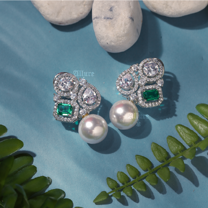 Diamond inspired earrings with Zirconia and colored jades that look spectacular. Enhanced with a pearl, the earrings make a statement.