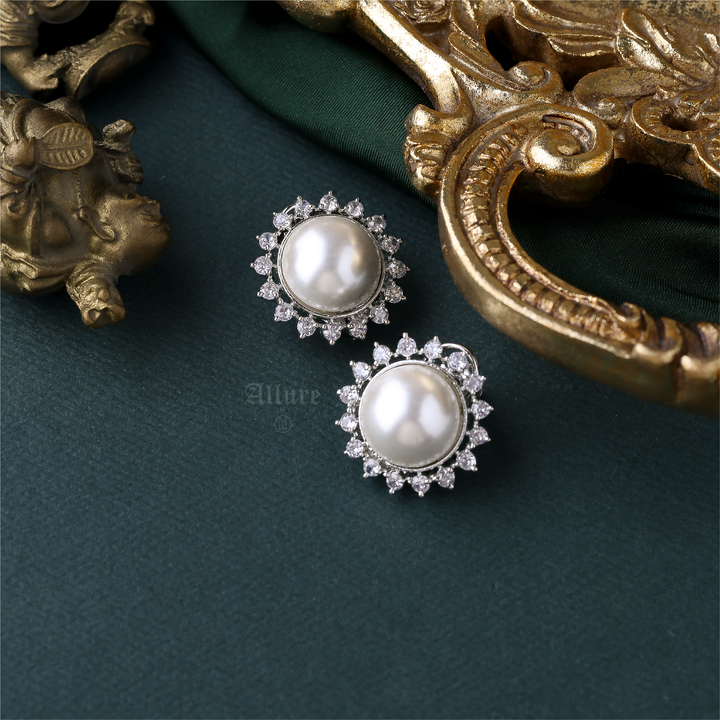 A sun inspired design with a pearl center and zirconia set intricately like rays