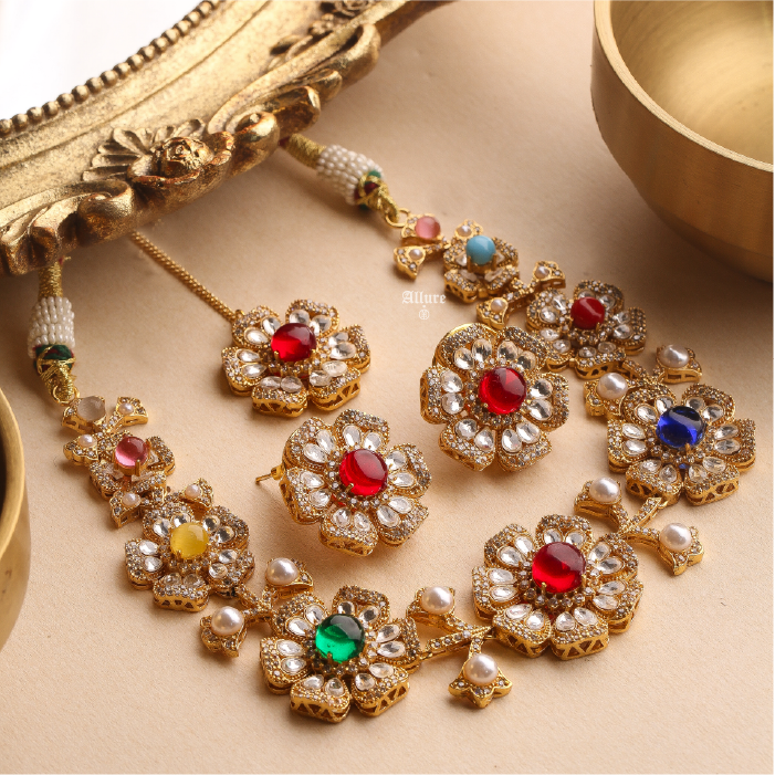 A heritage choker adorned with  jades in striking colors and  pearls, paired with exquisite floral earrings and a matching tika. This delicately styled set embodies timeless elegance, allowing you to experience the heritage and beauty of a bygone era 1. Due to the delicate nature of our jewelry, we regretfully cannot accept returns or exchanges. 2. Meticulously crafted using high-quality alloy, adorned with radiant gold/rhodium plating. 3. To maintain its allure, kindly refrain from contact with perfume or water. 4. Handle with care to keep your jewelry looking flawless over time. 5. Crafted to replicate the charm of fine jewelry without the high cost. 6. Created to be gentle on sensitive skin, offering both style and comfort. 7. Store in provided pouch or box to prevent damage and tangling. 8. Store in an airtight container to protect against tarnishing. |