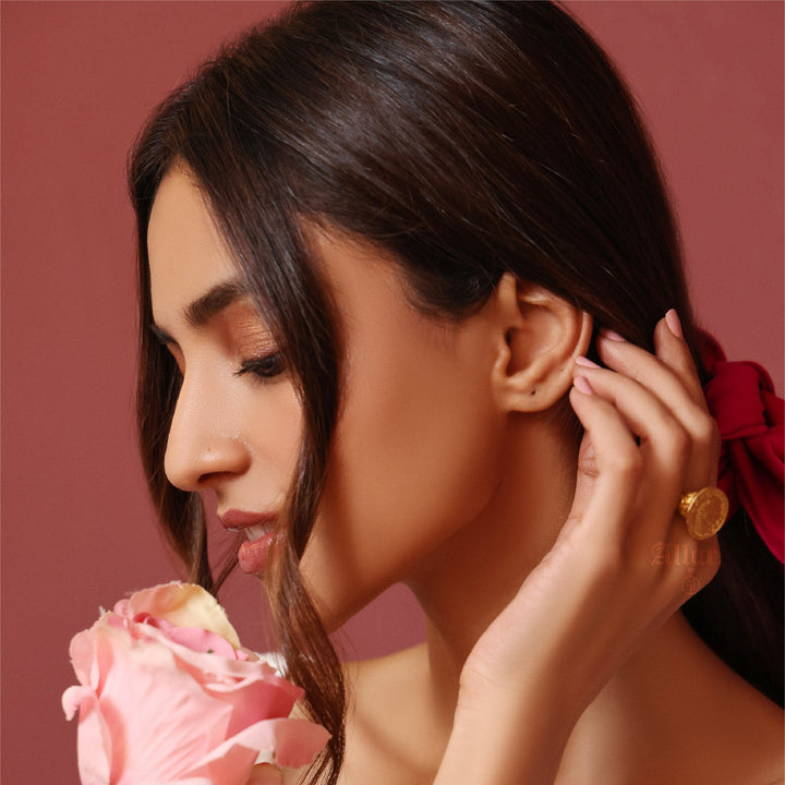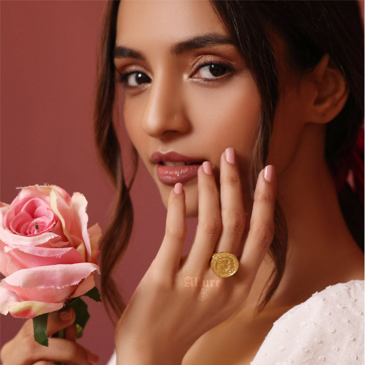 A beautiful and dainty gold coin ring that is trendy and bespoke.