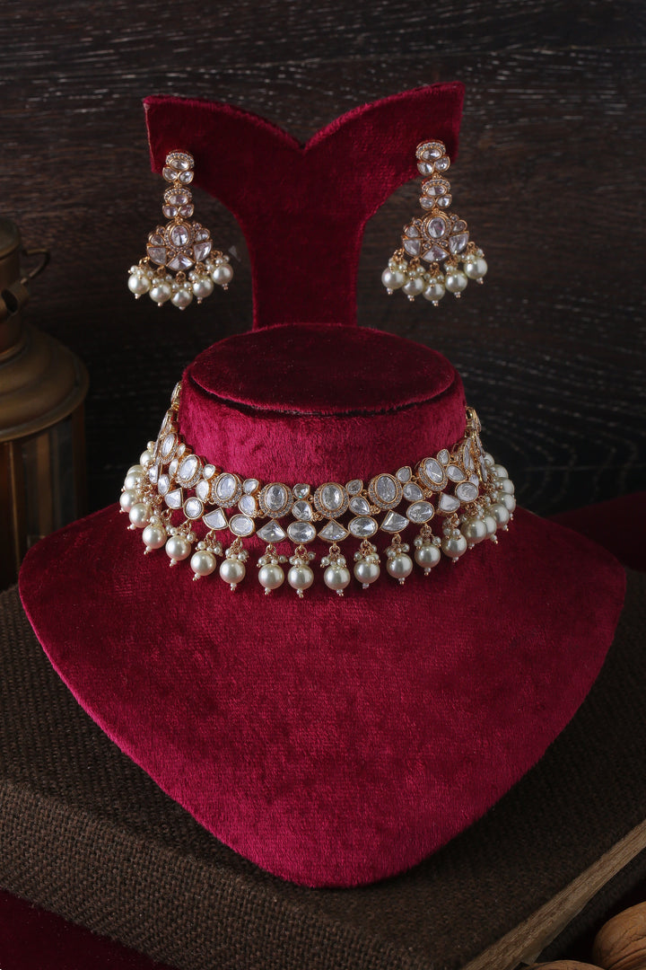 Elevate your elegance with Asfiya, a breathtaking jewelry set that exudes regal charm and timeless sophistication. Featuring a stunning polki necklace, meticulously adorned with intricate craftsmanship and finished with delicate faux pearls, this piece captures the essence of opulence. Complemented by matching earrings, Asfiya offers an ethereal allure.   1. Due to the delicate nature of our jewelry, we regretfully cannot accept returns or exchanges. 2. Meticulously crafted using high-quality alloy, adorned with radiant gold/rhodium plating. 3. To maintain its allure, kindly refrain from contact with perfume or water. 4. Handle with care to keep your jewelry looking flawless over time. 5. Crafted to replicate the charm of fine jewelry without the high cost. 6. Created to be gentle on sensitive skin, offering both style and comfort. 7. Store in provided pouch or box to prevent damage and tangling. 8. Store in an airtight container to protect against tarnishing. |