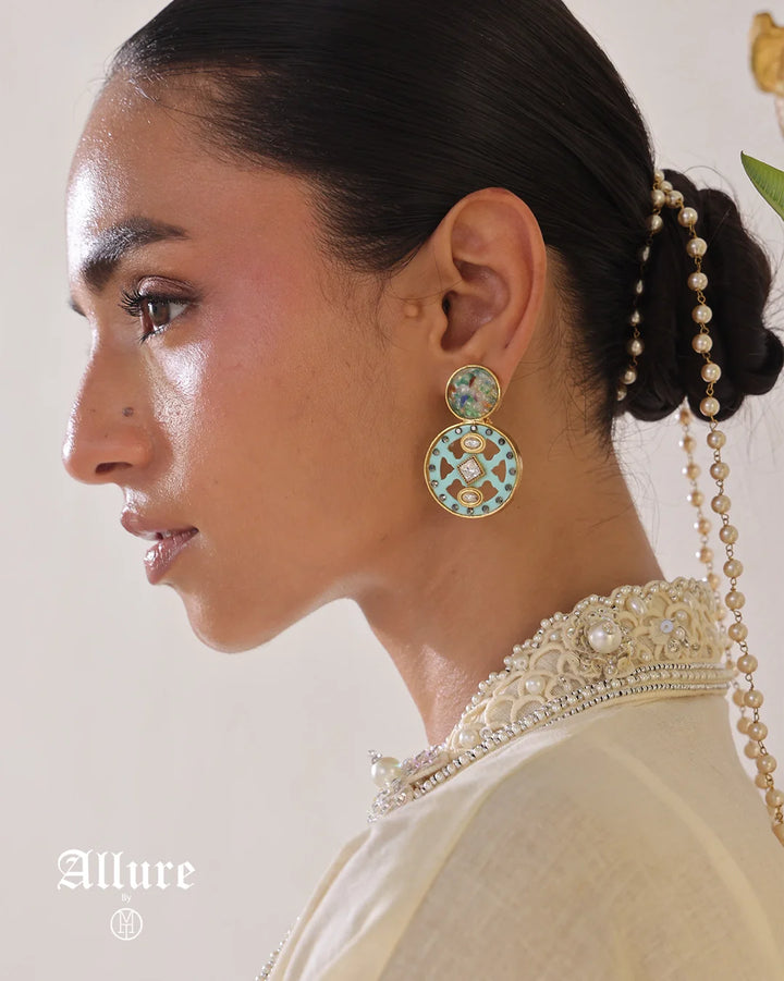 Polished, poised, and playfully structured — these teardrop-circle earrings feature gleaming Polo Stones in a whimsical eccentric blue enamel that catch the light with every turn. Whether you're wearing a classic shalwar kameez or a sharp blazer, they bring just the right dose of sparkle and sophistication. A statement in subtle rebellion.