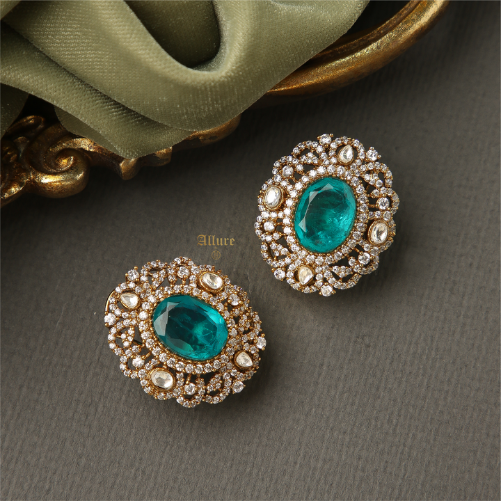 A colored oval jade with a with a rich setting of Zirconia and polki that looks drop, dead gorgeous.