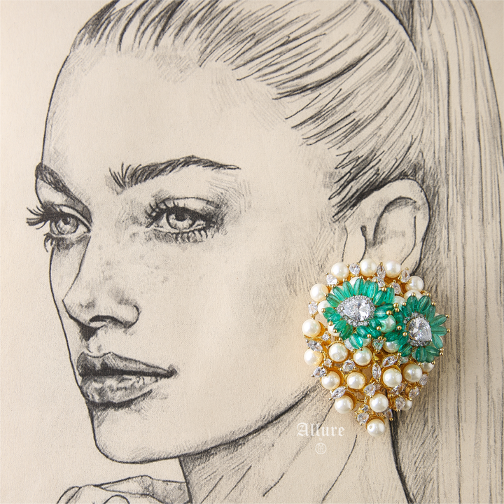 Barlas is a cluster of faux pearls enhanced with Zirconia. A vibrant pop of green florals enhnaces its beauty and the gold accent evokes its charm. An earring that is sure to make you steal the limelight, make an impression like never before.