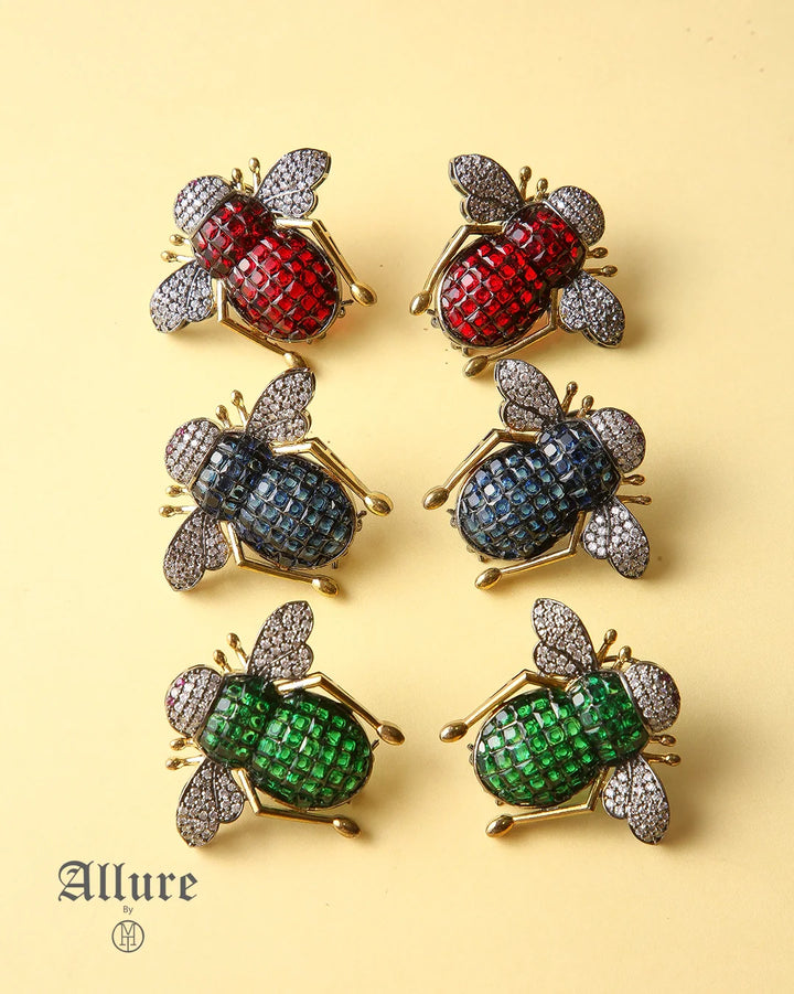 The Bee Charm is shaped like charming bees and set in a stunning Takkar setting, featuring sparkling zircon stones in green, red, blue, and more. These earrings offer a playful yet sophisticated design, with vibrant crystals adding a quirky touch to your accessories. Designed for special occasions rather than everyday wear, these earrings make a statement and are perfect for those who love to add a fun and elegant touch to their collection.